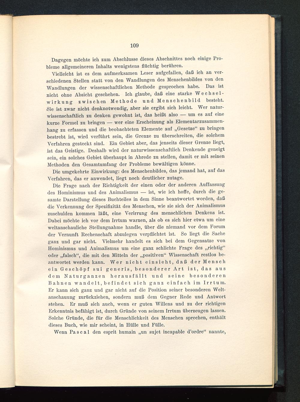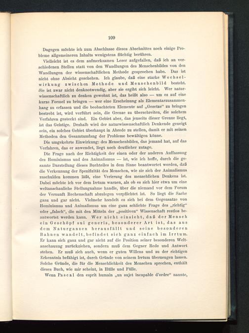 Vielleicht ist es dem aufmerksamen Leser aufgefallen, daß ich an ver-schiedenen Stellen statt von den Wandlungen des Menschenbildes von denWandlungen der wissenschaftlichen Methode gesprochen habe. Das istnicht ohne Absicht geschehen. Ich glaube, daß eine starke Wechsel-wirkung zwischen Methode und Menschenbild besteht.Sie ist zwar nicht denknotwendig, aber sie ergibt sich leicht. Wer natur-wissenschaftlich zu denken gewohnt ist, das heißt also — um es auf einekurze Formel zu bringen — wer eine Erscheinung als Elementarzusammen-hang zu erfassen und die beobachteten Elemente auf „Gesetze“ zu bringenbestrebt ist, wird verführt sein, die Grenze zu überschreiten, die solchemVerfahren gesteckt sind. Ein Gebiet aber, das jenseits dieser Grenze liegt,ist das Geistige. Deshalb wird der naturwissenschaftlich Denkende geneigtsein, ein solches Gebiet überhaupt in Abrede zu stellen, damit er mit seinenMethoden den Gesamtumfang der Probleme bewältigen könne.