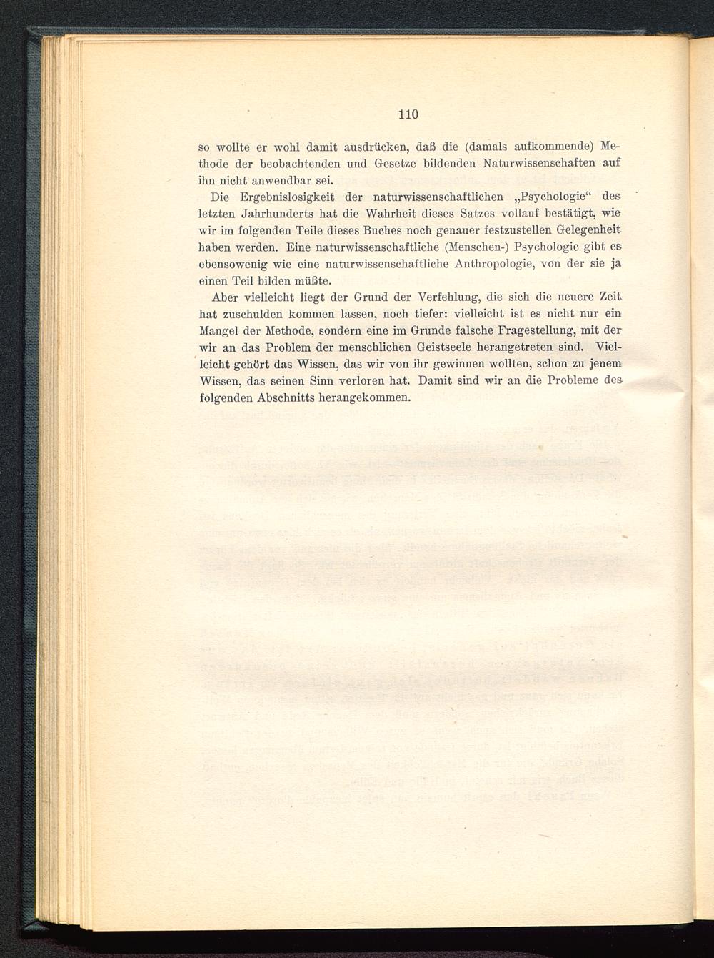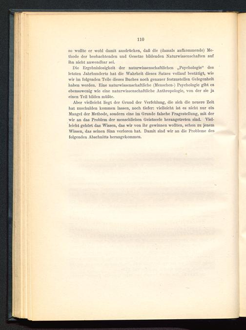 Die Ergebnislosigkeit der naturwissenschaftlichen „Psychologie“ desletzten Jahrhunderts hat die Wahrheit dieses Satzes vollauf bestätigt, wiewir im folgenden Teile dieses Buches noch genauer festzustellen Gelegenheithaben werden. Eine naturwissenschaftliche (Menschen-) Psychologie gibt esebensowenig wie eine naturwissenschaftliche Anthropologie, von der sie jaeinen Teil bilden müßte.