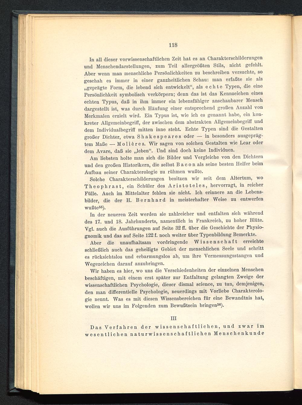 In all dieser vorwissenschaftlichen Zeit hat es an Charakterschilderungenund Menschendarstellungen, zum Teil allergrößten Stils, nicht gefehlt.Aber wenn man menschliche Persönlichkeiten zu beschreiben versuchte, sogeschah es immer in einer ganzheitlichen Schau: man erfaßte sie als„geprägte Form, die lebend sich entwickelt“, als echte Typen, die einePersönlichkeit symbolisch verkörpern; denn das ist das Kennzeichen einesechten Typus, daß in ihm immer ein lebensfähiger anschaubarer Menschdargestellt ist, was durch Häufung einer entsprechend großen Anzahl vonMerkmalen erzielt wird. Ein Typus ist, wie ich es genannt habe, ein kon-kreter Allgemeinbegriff, der zwischen dem abstrakten Allgemeinbegriff unddem Individualbegriff mitten inne steht. Echte Typen sind die Gestaltengroßer Dichter, etwa Shakespeares oder — in besonders ausgepräg-tem Maße — M o 1 i e r e s. Wir sagen von solchen Gestalten wie Lear oderdem Avare, daß sie „leben“. Und sind doch keine Individuen.