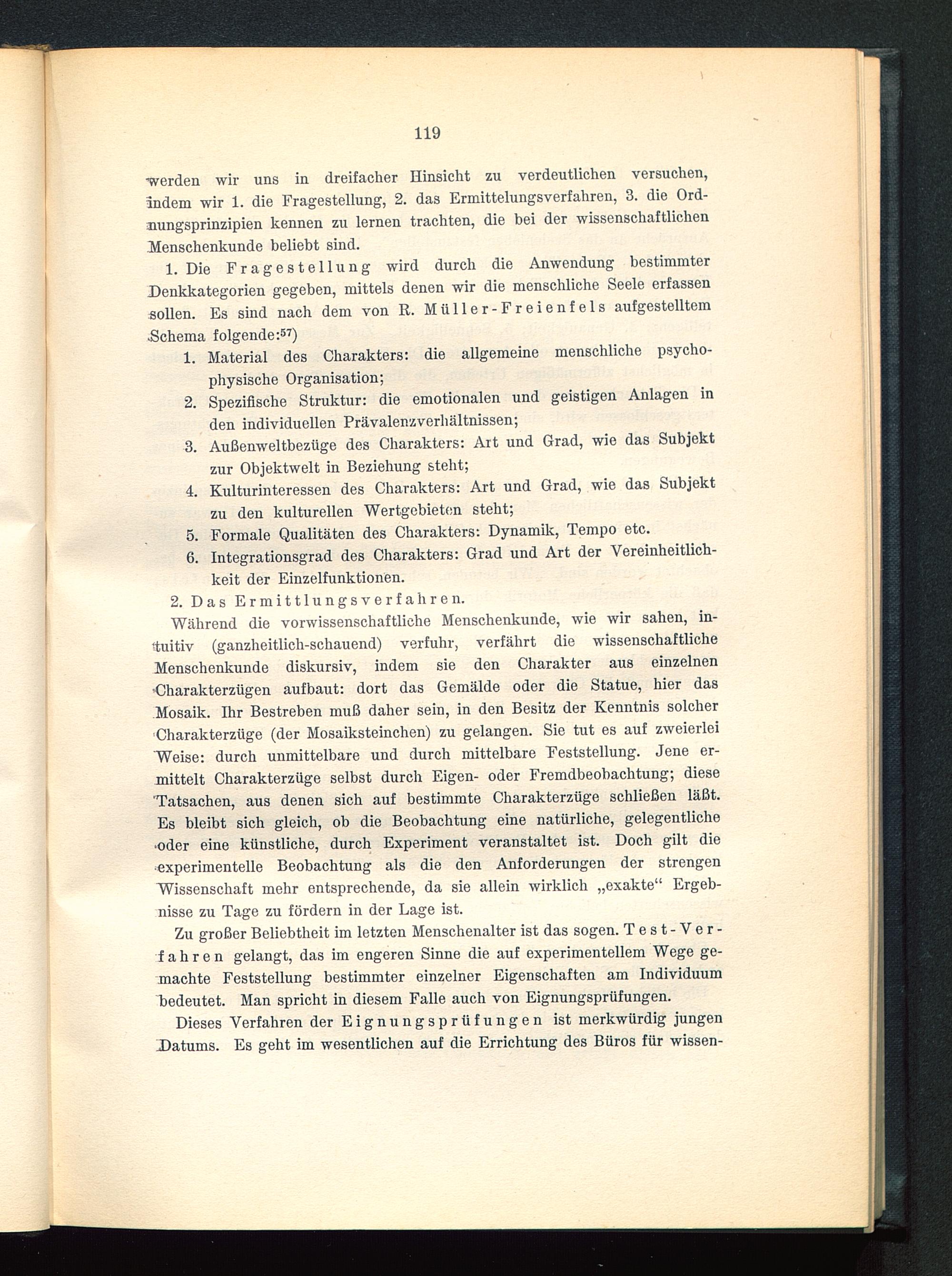 werden wir uns in dreifacher Hinsicht zu verdeutlichen versuchen,Indem wir 1. die Fragestellung, 2. das Ermittelungsverfahren, 3. die Ord-uungsprinzipien kennen zu lernen trachten, die bei der wissenschaftlichenMenschenkunde beliebt sind.