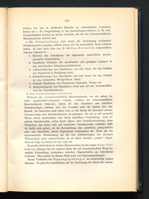 1. Die Fragestellung wird durch die Anwendung bestimmterDenkkategorien gegeben, mittels denen wir die menschliche Seele erfassensollen. Es sind nach dem von R. Müller-Freienfels aufgestelltem•Schema folgende: 57 )