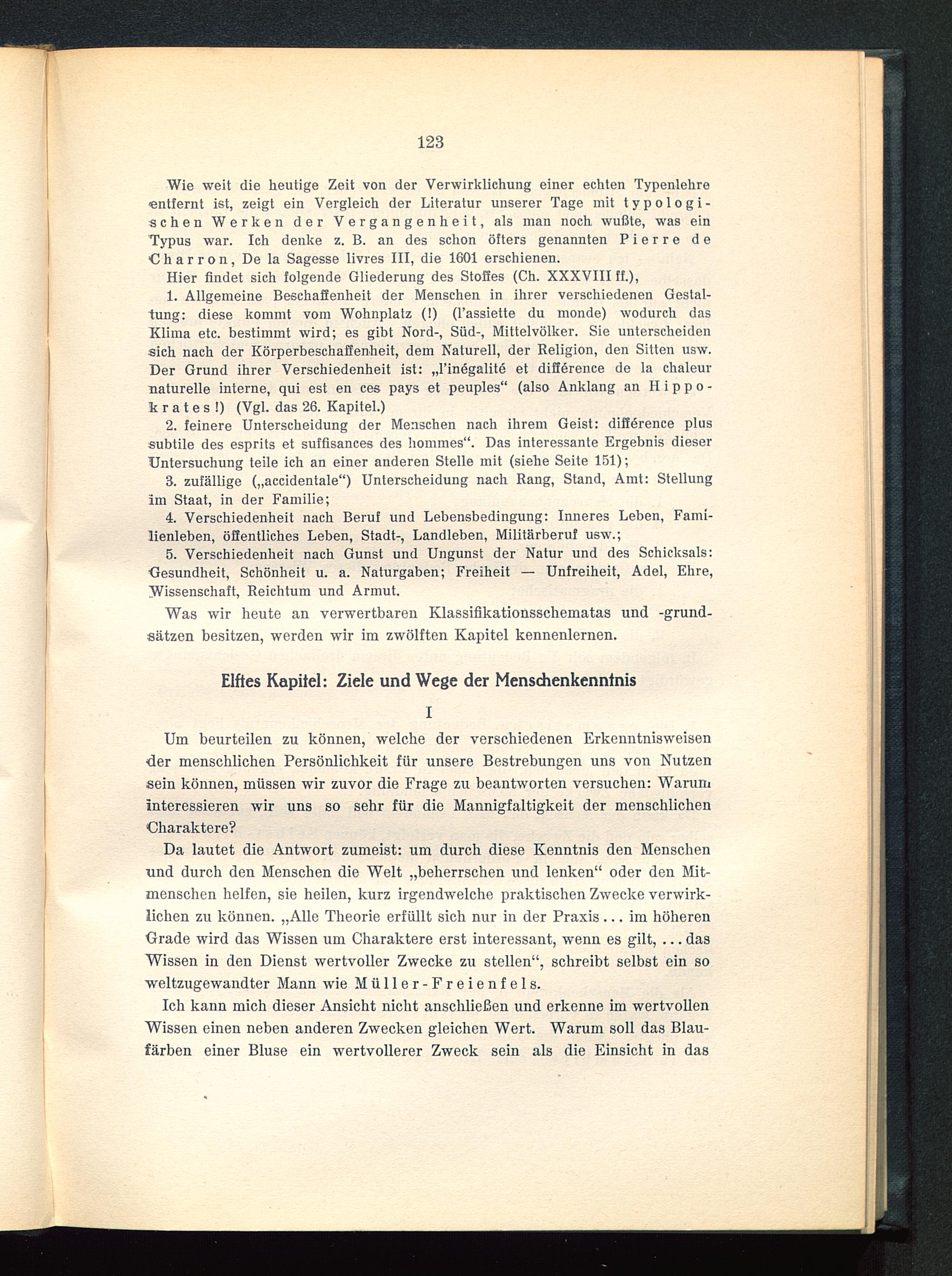 Wie weit die heutige Zeit von der Verwirklichung einer echten Typenlehre«entfernt ist, zeigt ein Vergleich der Literatur unserer Tage mit typologi-schen Werken der Vergangenheit, als man noch wußte, was einTypus war. Ich denke z. B. an des schon öfters genannten Pierre deCharron, De la Sagesse livres III, die 1601 erschienen.