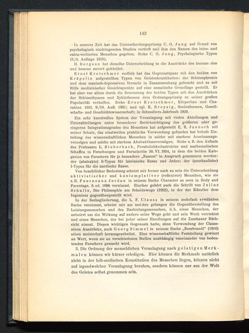 Ein sehr kunstvolles System der Veranlagung mit vielen Abteilungen undUnterabteilungen unter besonderer Berücksichtigung des größeren oder ge-ringeren Integrationsgrades des Menschen hat aufgestellt E. R. Jaensch mitseiner Schule, das einstweilen praktische Verwendung gefunden hat behufs Ein-teilung der wissenschaftlichen Menschen in solche mit starkem Anschauungs-vermögen und solche mit starkem Abstraktionsvermögen. Siehe z. B. den Aufsatzdes Professors L. Bieberbach, Persönlichkeitsstruktur und mathematischesSchaffen in Forschungen und Fortschritte 20. VI. 1934, in dem die beiden Kate-gorien von Forschern für je besondere „Rassen“ in Anspruch genommen werden:der (abstrakte) S-Typus für lateinische Rasse und Juden; der (anschauliche)I-Typus für die nordische Rasse.