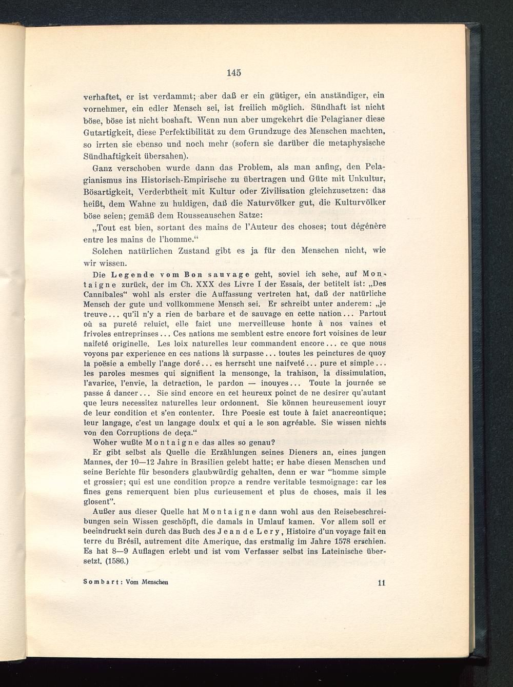 Außer aus dieser Quelle hat Montaigne dann wohl aus den Reisebeschrei-bungen sein Wissen geschöpft, die damals in Umlauf kamen. Vor allem soll erbeeindruckt sein durch das Buch des JeandeLery, Histoire d’un voyage fait enterre du Brösil, autrement dite Amerique, das erstmalig im Jahre 1578 erschien.Es hat 8—9 Auflagen erlebt und ist vom Verfasser selbst ins Lateinische über-setzt. (1586.)
