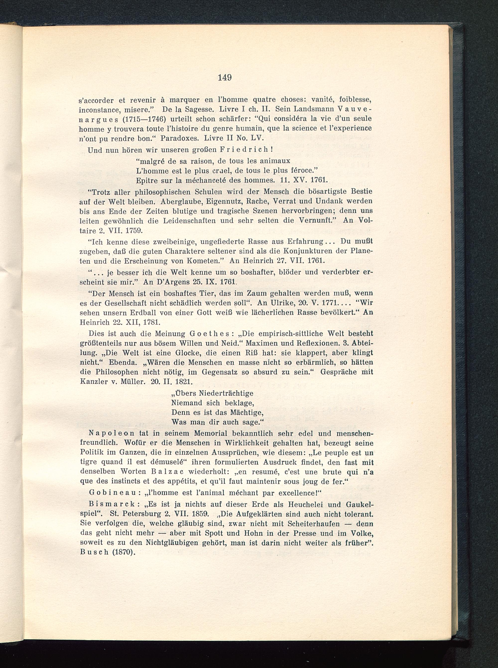 “Trotz aller philosophischen Schulen wird der Mensch die bösartigste Bestieauf der Welt bleiben. Aberglaube, Eigennutz, Rache, Verrat und Undank werdenbis ans Ende der Zeiten blutige und tragische Szenen hervorbringen; denn unsleiten gewöhnlich die Leidenschaften und sehr selten die Vernunft.” An Vol-taire 2. VII. 1759.