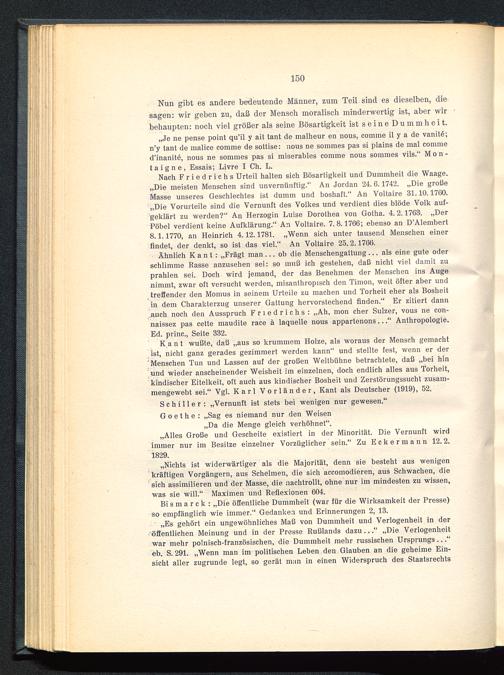 Kant wußte, daß „aus so krummem Holze, als woraus der Mensch gemachtist, nicht ganz gerades gezimmert werden kann“ und stellte fest, wenn er der‘Menschen Tun und Lassen auf der großen Weltbühne betrachtete, daß „bei hinund wieder anscheinender Weisheit im einzelnen, doch endlich alles aus Torheit,kindischer Eitelkeit, oft auch aus kindischer Bosheit und Zerstörungssucht zusam-mengewebt sei.“ Vgl. Karl Vorländer , Kant als Deutscher (1919), 52.
