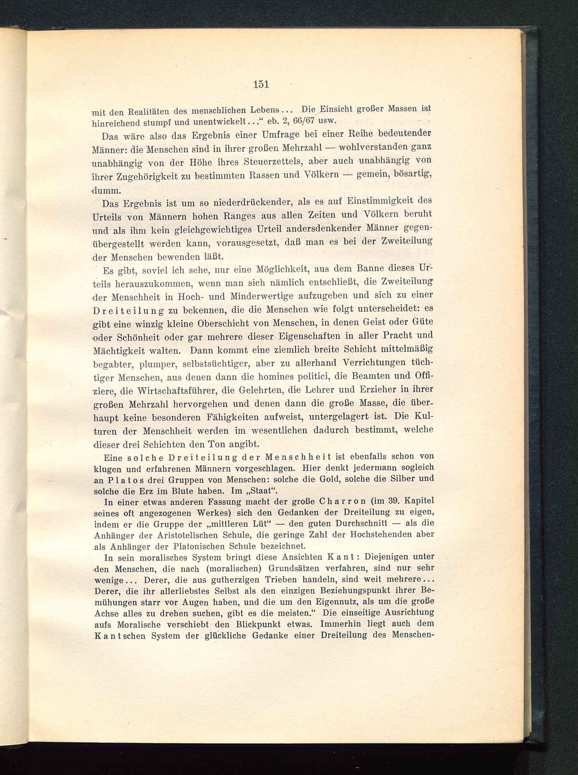 In einer etwas anderen Fassung macht der große C h a r r o n (im 39. Kapitelseines oft angezogenen Werkes) sich den Gedanken der Dreiteilung zu eigen,indem er die Gruppe der „mittleren Lüt“ — den guten Durchschnitt — als dieAnhänger der Aristotelischen Schule, die geringe Zahl der Hochstehenden aberals Anhänger der Platonischen Schule bezeichnet.
