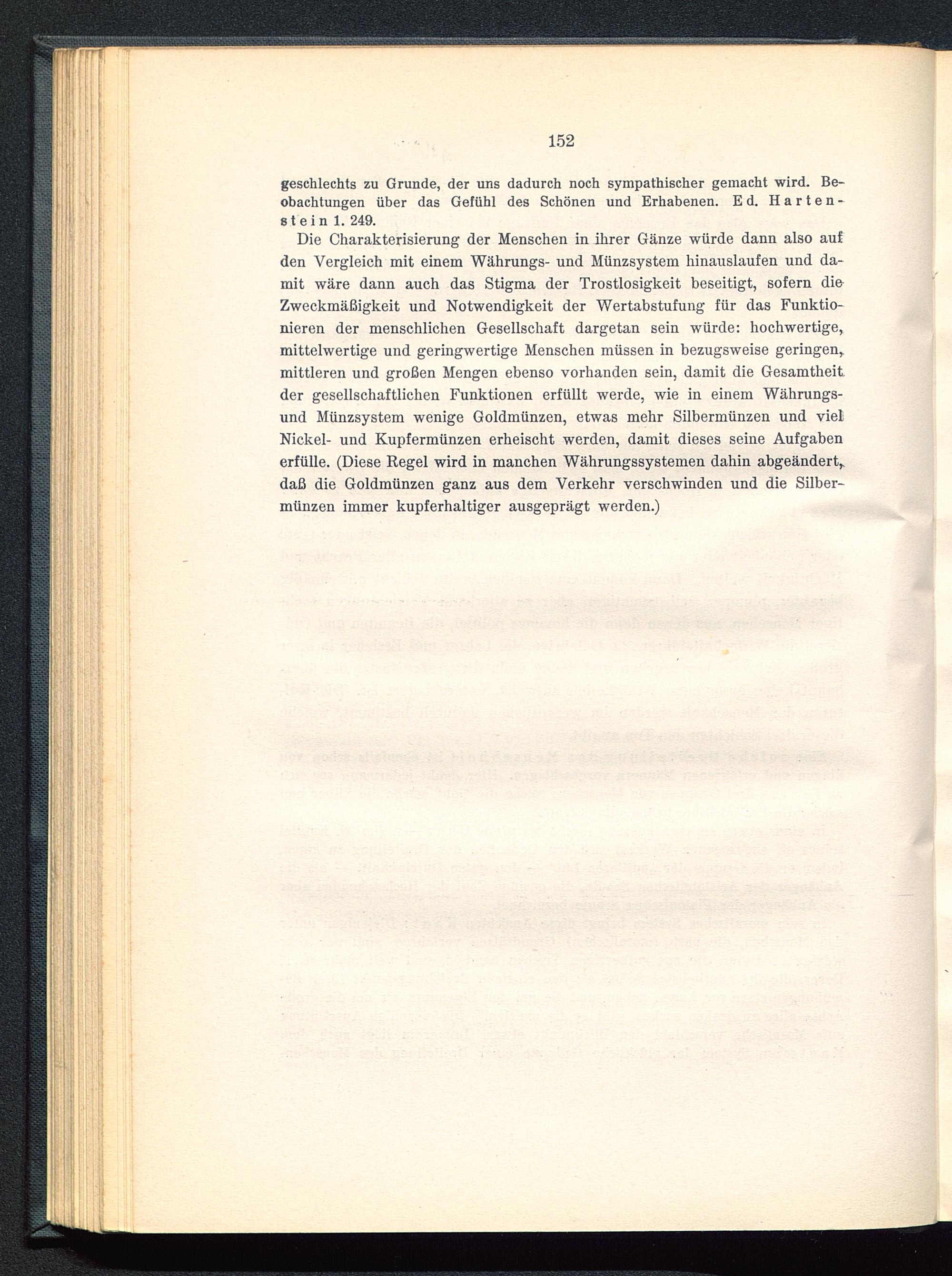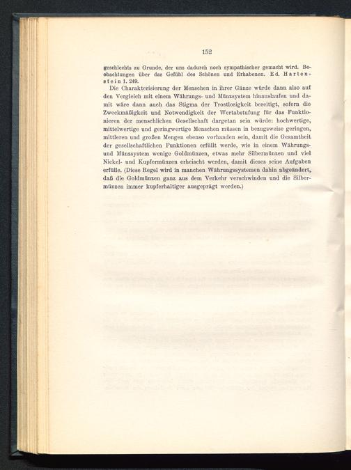 Die Charakterisierung der Menschen in ihrer Gänze würde dann also aufden Vergleich mit einem Währungs- und Münzsystem hinauslaufen und da-mit wäre dann auch das Stigma der Trostlosigkeit beseitigt, sofern dieZweckmäßigkeit und Notwendigkeit der Wertabstufung für das Funktio-nieren der menschlichen Gesellschaft dargetan sein würde: hochwertige,mittelwertige und geringwertige Menschen müssen in bezugsweise geringen»mittleren und großen Mengen ebenso vorhanden sein, damit die Gesamtheitder gesellschaftlichen Funktionen erfüllt werde, wie in einem Währungs-und Münzsystem wenige Goldmünzen, etwas mehr Silbermünzen und vielNickel- und Kupfermünzen erheischt werden, damit dieses seine Aufgabenerfülle. (Diese Regel wird in manchen Währungssystemen dahin abgeändert»daß die Goldmünzen ganz aus dem Verkehr verschwinden und die Silber-münzen immer kupferhaltiger ausgeprägt werden.)
