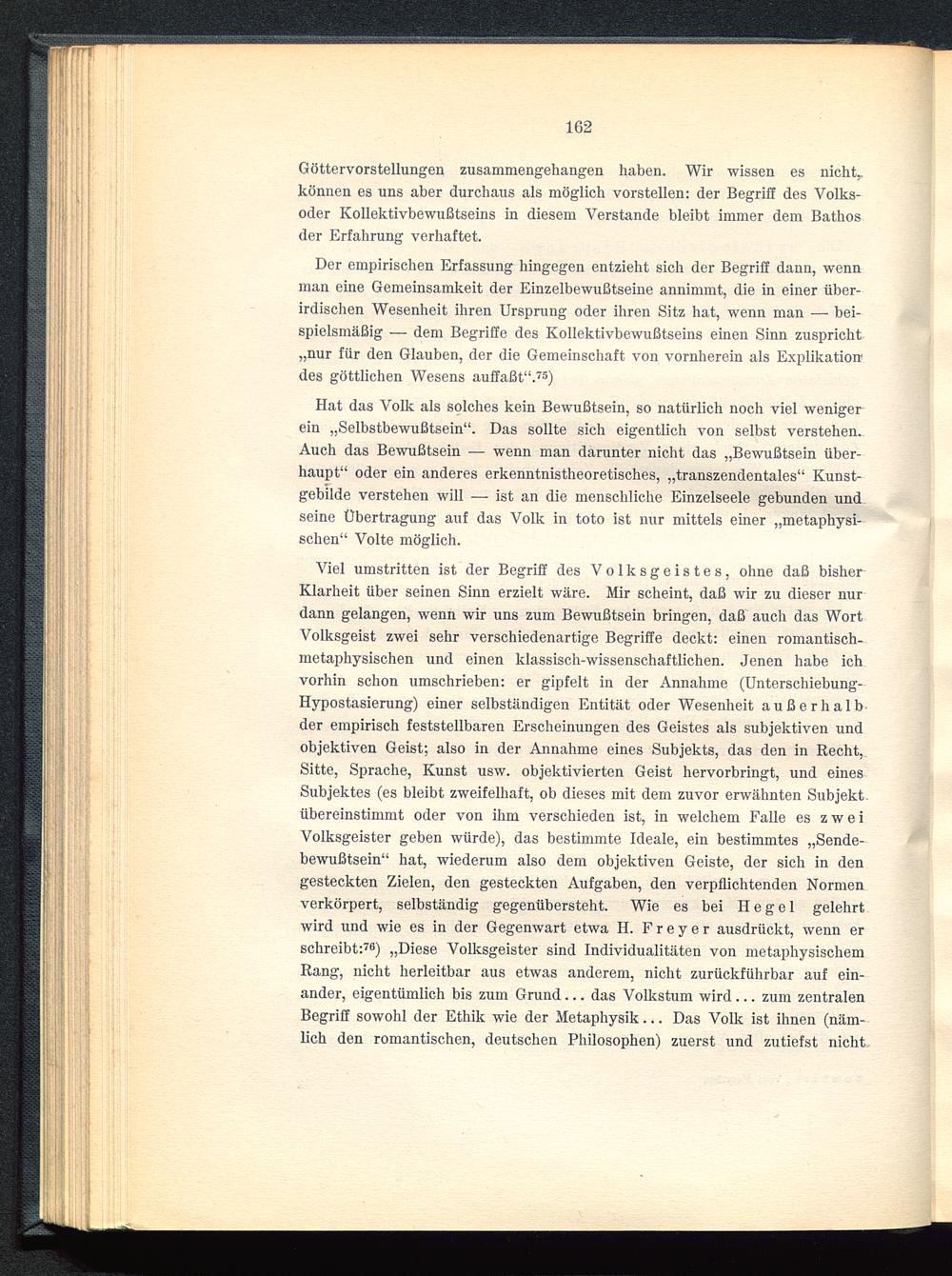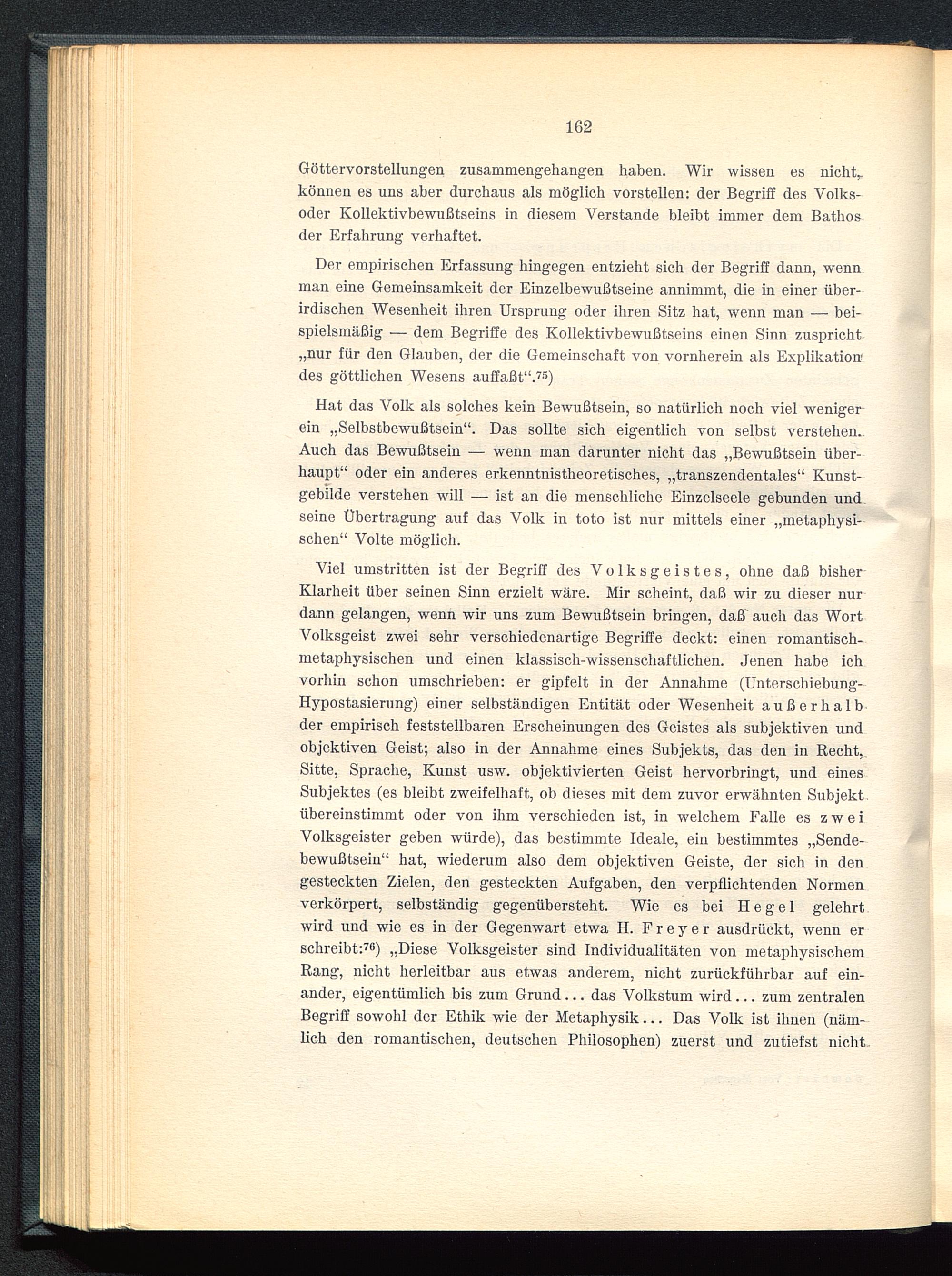 Viel umstritten ist der Begriff des Volksgeistes, ohne daß bisherKlarheit über seinen Sinn erzielt wäre. Mir scheint, daß wir zu dieser nurdann gelangen, wenn wir uns zum Bewußtsein bringen, daß auch das WortVolksgeist zwei sehr verschiedenartige Begriffe deckt: einen romantisch-metaphysischen und einen klassisch-wissenschaftlichen. Jenen habe ichvorhin schon umschrieben: er gipfelt in der Annahme (Unterschiebung-Hypostasierung) einer selbständigen Entität oder Wesenheit außerhalbder empirisch feststellbaren Erscheinungen des Geistes als subjektiven undobjektiven Geist; also in der Annahme eines Subjekts, das den in Recht,Sitte, Sprache, Kunst usw. objektivierten Geist hervorbringt, und einesSubjektes (es bleibt zweifelhaft, ob dieses mit dem zuvor erwähnten Subjekt,übereinstimmt oder von ihm verschieden ist, in welchem Falle es zweiVolksgeister geben würde), das bestimmte Ideale, ein bestimmtes „Sende-bewußtsein“ hat, wiederum also dem objektiven Geiste, der sich in dengesteckten Zielen, den gesteckten Aufgaben, den verpflichtenden Normenverkörpert, selbständig gegenübersteht. Wie es bei Hegel gelehrtwird und wie es in der Gegenwart etwa H. F r e y e r ausdrückt, wenn erschreibt: 76 ) „Diese Volksgeister sind Individualitäten von metaphysischemRang, nicht herleitbar aus etwas anderem, nicht zurückführbar auf ein-ander, eigentümlich bis zum Grund... das Volkstum wird... zum zentralenBegriff sowohl der Ethik wie der Metaphysik... Das Volk ist ihnen (näm-lich den romantischen, deutschen Philosophen) zuerst und zutiefst nicht