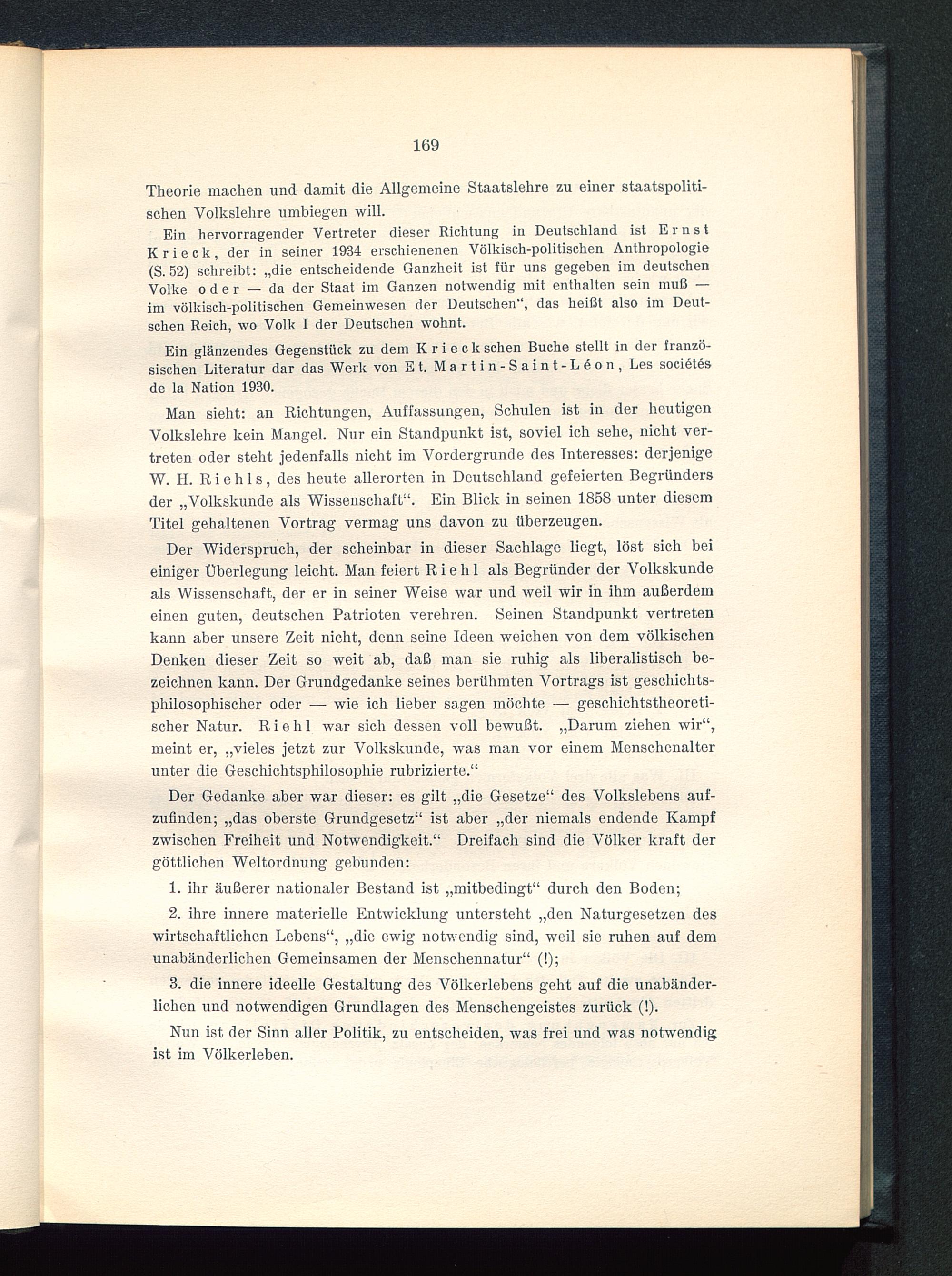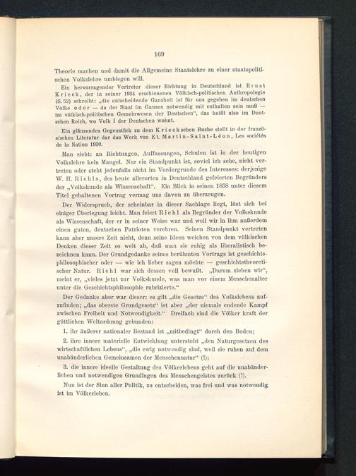 Ein hervorragender Vertreter dieser Richtung in Deutschland ist ErnstKrieck , der in seiner 1934 erschienenen Völkisch-politischen Anthropologie(S. 52) schreibt: „die entscheidende Ganzheit ist für uns gegeben im deutschenVolke oder — da der Staat im Ganzen notwendig mit enthalten sein muß —im völkisch-politischen Gemeinwesen der Deutschen", das heißt also im Deut-schen Reich, wo Volk I der Deutschen wohnt.