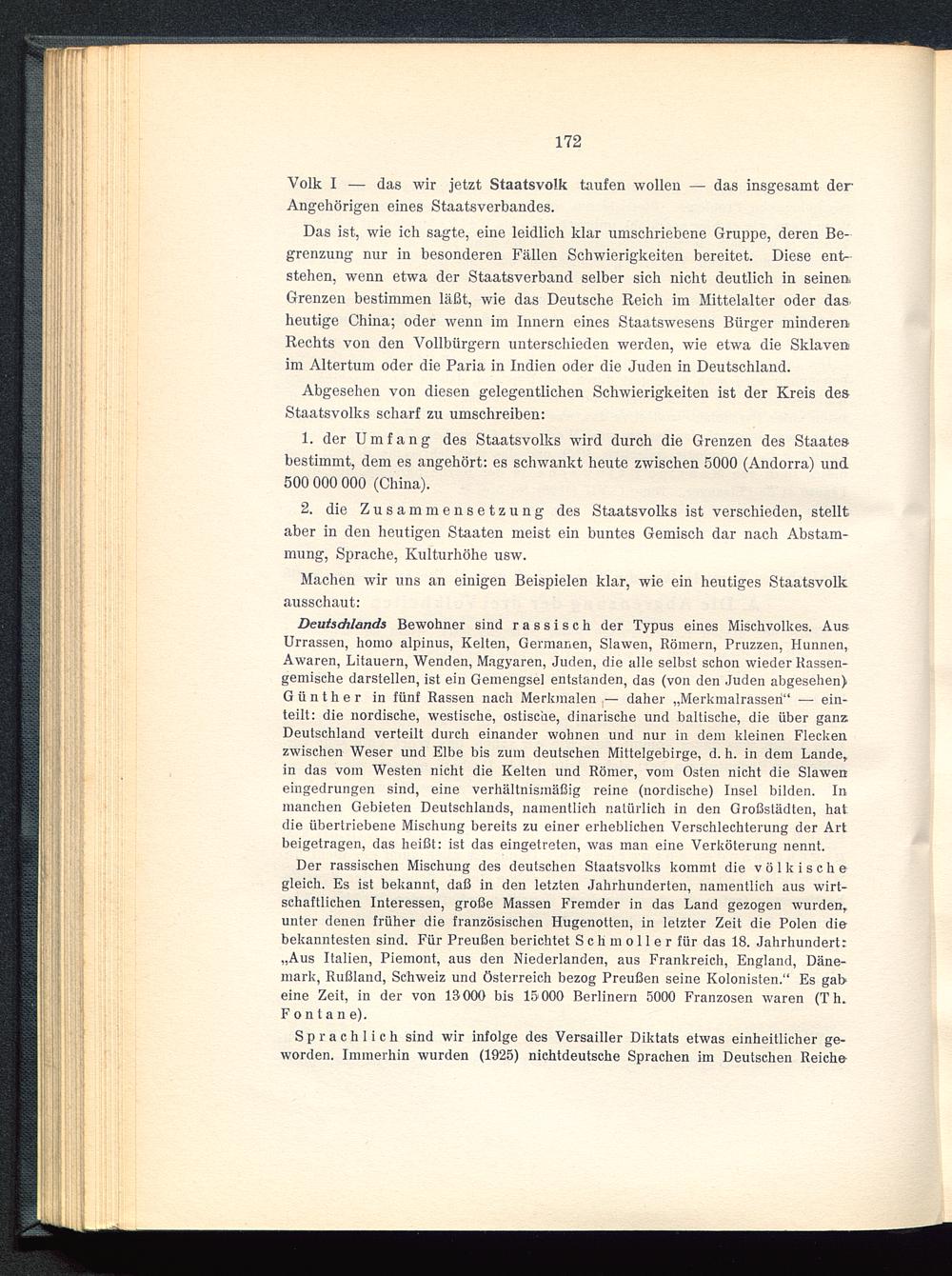 Der rassischen Mischung des deutschen Staatsvolks kommt die völkischegleich. Es ist bekannt, daß in den letzten Jahrhunderten, namentlich aus wirt-schaftlichen Interessen, große Massen Fremder in das Land gezogen wurden,unter denen früher die französischen Hugenotten, in letzter Zeit die Polen diebekanntesten sind. Für Preußen berichtet S c h m o 11 e r für das 18. Jahrhundert:„Aus Italien, Piemont, aus den Niederlanden, aus Frankreich, England, Däne-mark, Rußland, Schweiz und Österreich bezog Preußen seine Kolonisten.“ Es gabeine Zeit, in der von 13000 bis 15000 Berlinern 5000 Franzosen waren (Th.Fontane).