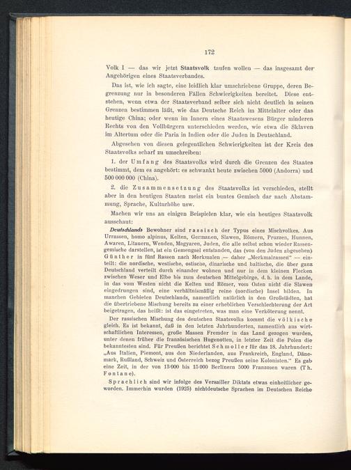 Das ist, wie ich sagte, eine leidlich klar umschriebene Gruppe, deren Be-grenzung nur in besonderen Fällen Schwierigkeiten bereitet. Diese ent-stehen, wenn etwa der Staatsverband selber sich nicht deutlich in seinemGrenzen bestimmen läßt, wie das Deutsche Reich im Mittelalter oder dasheutige China; oder wenn im Innern eines Staatswesens Bürger minderenRechts von den Vollbürgern unterschieden werden, wie etwa die Sklavenim Altertum oder die Paria in Indien oder die Juden in Deutschland .