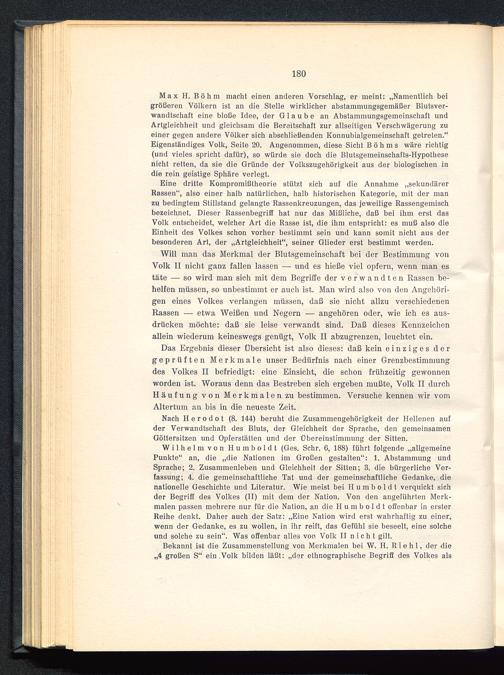 Max H. Böhm macht einen anderen Vorschlag, er meint: „Namentlich beigrößeren Völkern ist an die Stelle wirklicher abstammungsgemäßer Blutsver-wandtschaft eine bloße Idee, der Glaube an Abstammungsgemeinschaft undArtgleichheit und gleichsam die Bereitschaft zur allseitigen Verschwägerung zueiner gegen andere Völker sich abschließenden Konnubialgemeinschaft getreten.“Eigenständiges Volk, Seite 20. Angenommen, diese Sicht Böhms wäre richtig(und vieles spricht dafür), so würde sie doch die Blutsgemeinschafts-Hypothesenicht retten, da sie die Gründe der Volkszugehörigkeit aus der biologischen indie rein geistige Sphäre verlegt.