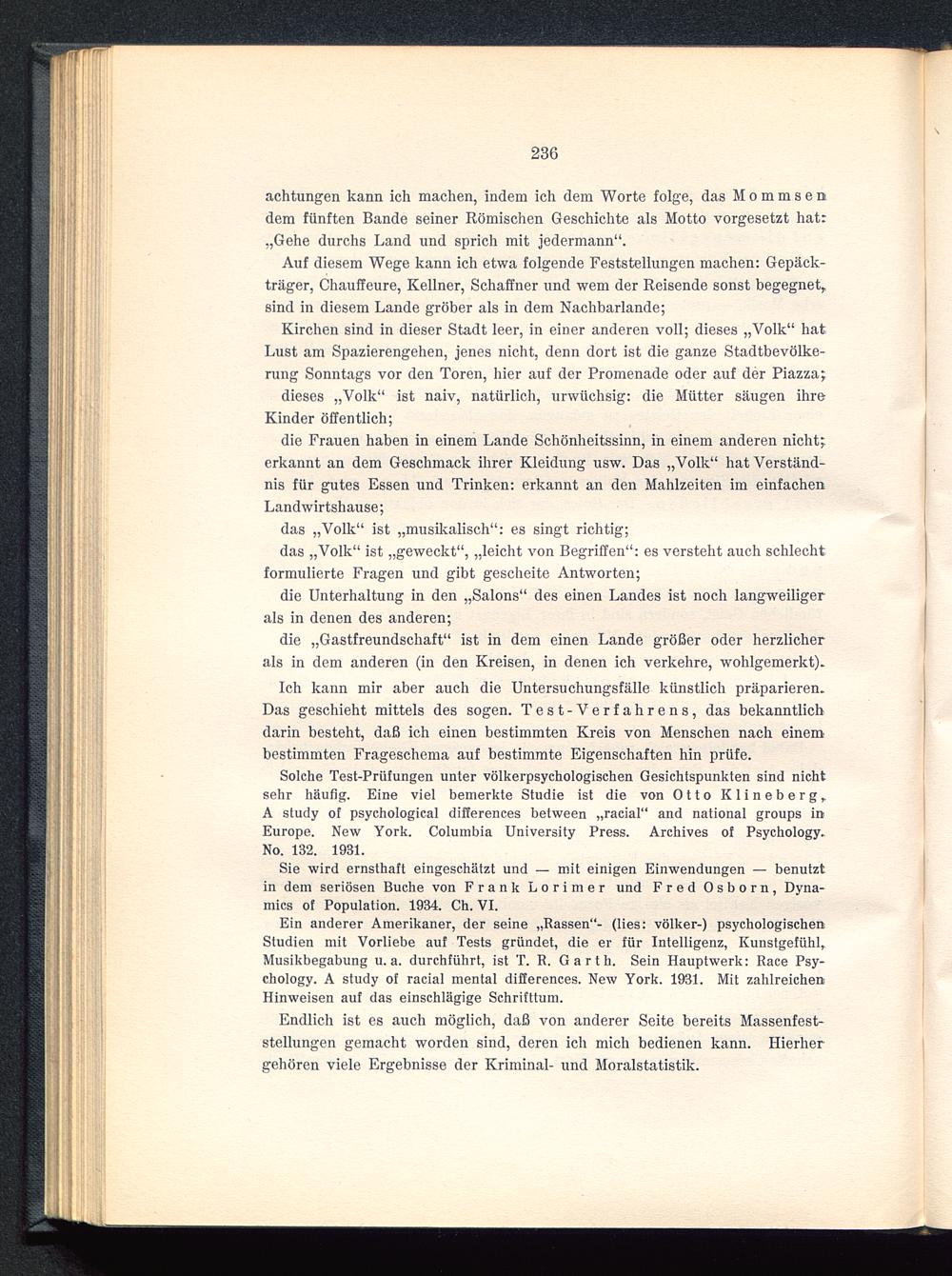 Solche Test-Prüfungen unter völkerpsychologischen Gesichtspunkten sind nichtsehr häufig. Eine viel bemerkte Studie ist die von Otto Klineberg, A study of psychological differences between „racial“ and national groups inEurope. New York. Columbia University Press. Archives of Psychology.No. 132. 1931.