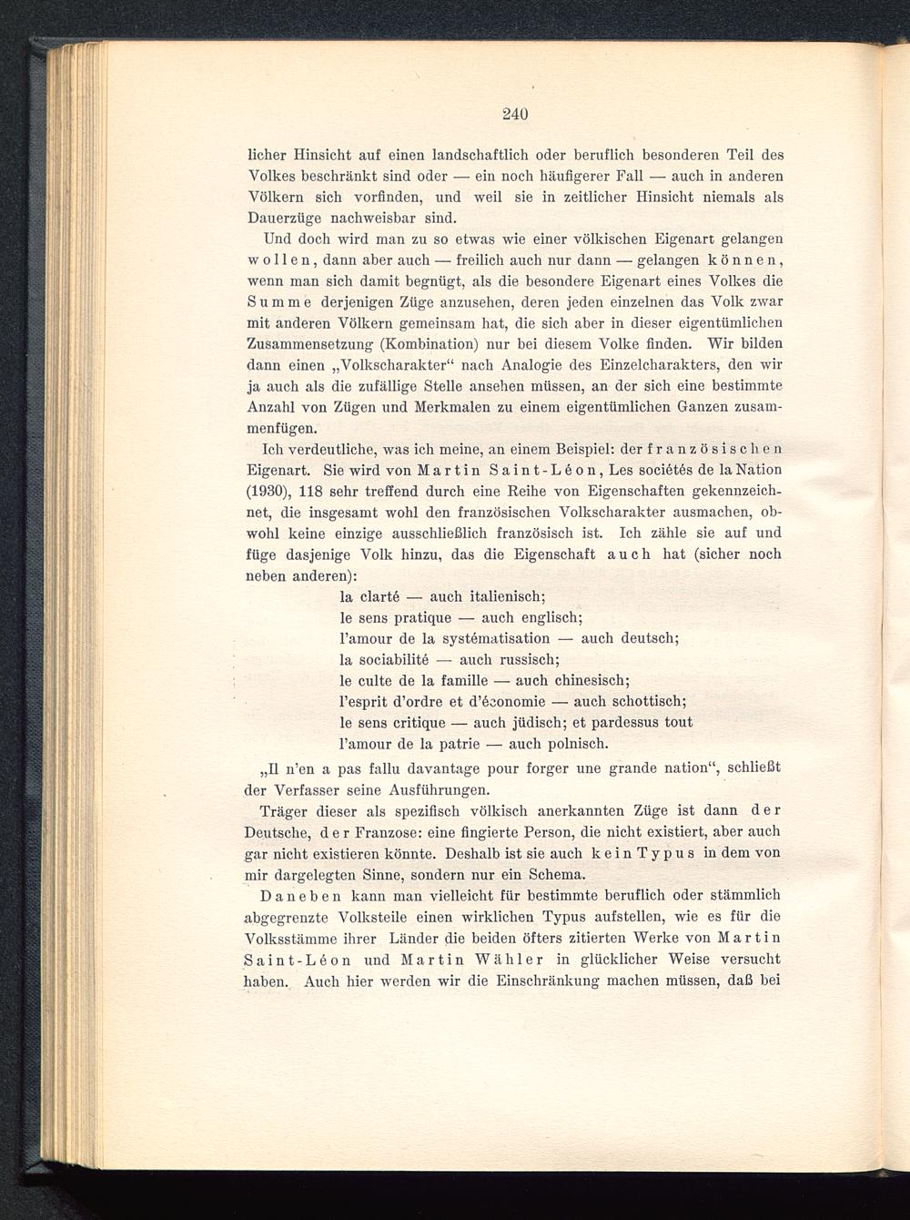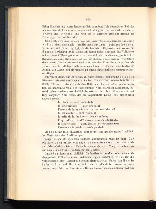 Ich verdeutliche, was ich meine, an einem Beispiel: der französischenEigenart. Sie wird von Martin Saint-Leon, Les soci6t6s de laNation(1930), 118 sehr treffend durch eine Reihe von Eigenschaften gekennzeich-net, die insgesamt wohl den französischen Volkscharakter ausmachen, ob-wohl keine einzige ausschließlich französisch ist. Ich zähle sie auf undfüge dasjenige Volk hinzu, das die Eigenschaft auch hat (sicher nochneben anderen):
