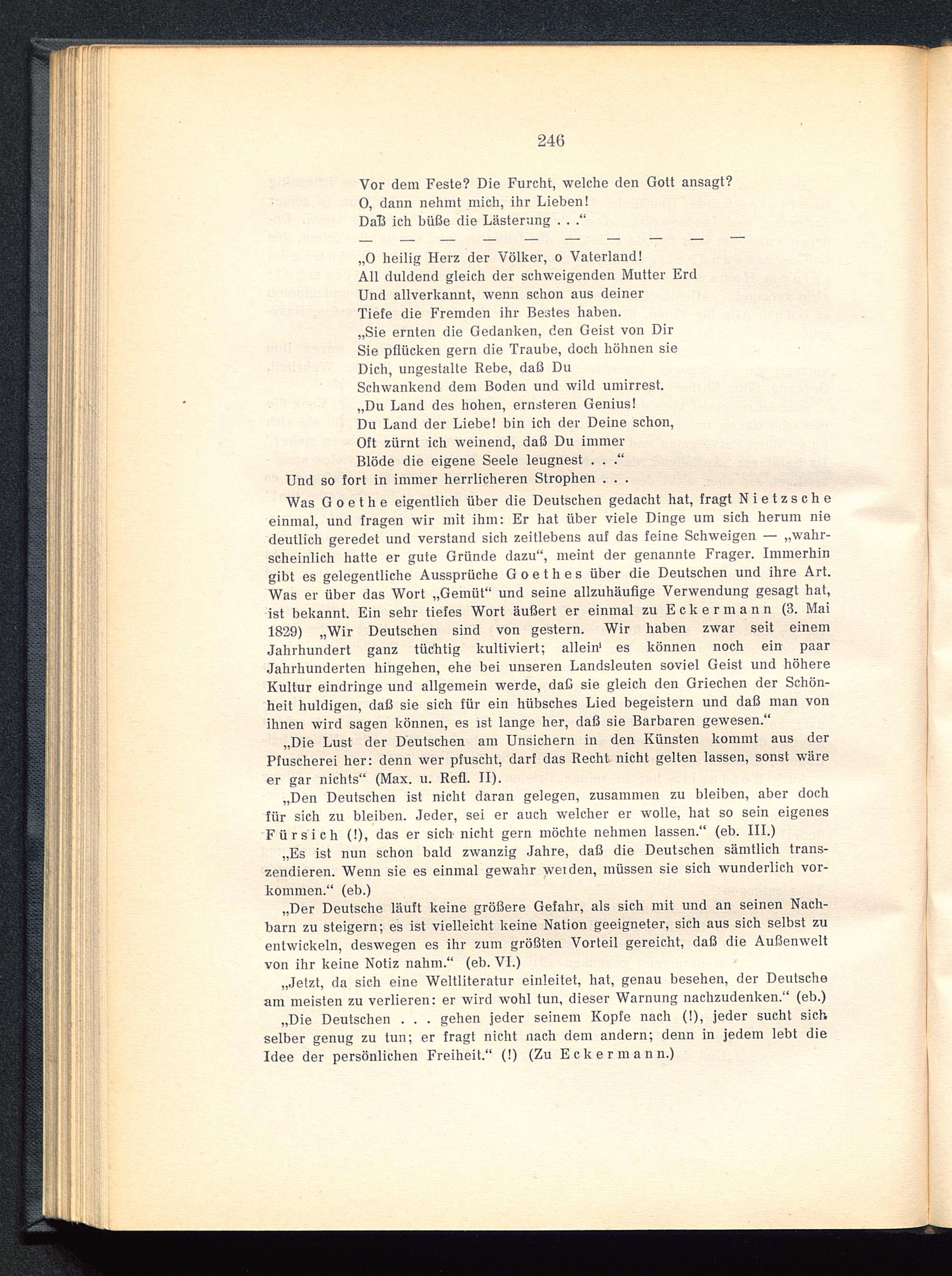 Was Goethe eigentlich über die Deutschen gedacht hat, fragt Nietzsche einmal, und fragen wir mit ihm: Er hat über viele Dinge um sich herum niedeutlich geredet und verstand sich zeitlebens auf das feine Schweigen — „wahr-scheinlich hatte er gute Gründe dazu“, meint der genannte Frager. Immerhingibt es gelegentliche Aussprüche Goethes über die Deutschen und ihre Art.Was er über das Wort „Gemüt“ und seine allzuhäufige Verwendung gesagt hat,ist bekannt. Ein sehr tiefes Wort äußert er einmal zu Ecker mann (3. Mai1829) „Wir Deutschen sind von gestern. Wir haben zwar seit einemJahrhundert ganz tüchtig kultiviert; allein 1 es können noch ein paarJahrhunderten hingehen, ehe bei unseren Landsleuten soviel Geist und höhereKultur eindringe und allgemein werde, daß sie gleich den Griechen der Schön-heit huldigen, daß sie sich für ein hübsches Lied begeistern und daß man vonihnen wird sagen können, es ist lange her, daß sie Barbaren gewesen.“