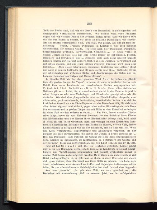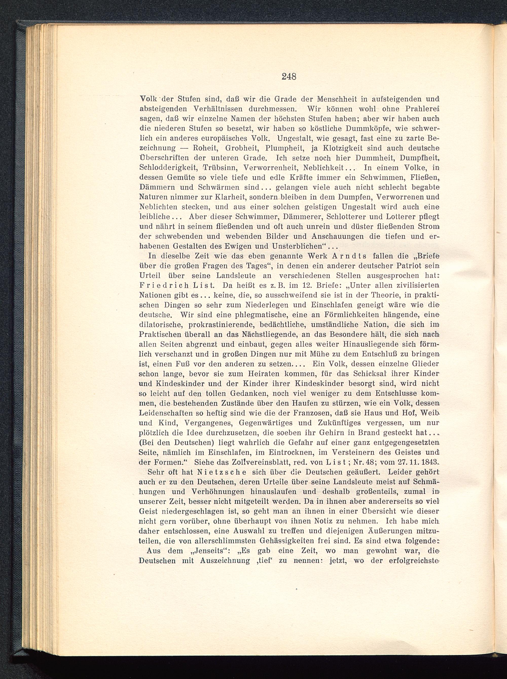 In dieselbe Zeit wie das eben genannte Werk Arndts fallen die „BriefeUber die großen Fragen des Tages“, in denen ein anderer deutscher Patriot seinUrteil über seine Landsleute an verschiedenen Stellen ausgesprochen hat:Friedrich List. Da heißt es z. B. im 12. Briefe: „Unter allen zivilisiertenNationen gibt es... keine, die, so ausschweifend sie ist in der Theorie, in prakti-schen Dingen so sehr zum Niederlegen und Einschlafen geneigt wäre wie diedeutsche. Wir sind eine phlegmatische, eine an Förmlichkeiten hängende, einedilatorische, prokrastinierende, bedächtliche, umständliche Nation, die sich imPraktischen überall an das Nächstliegende, an das Besondere hält, die sich nachallen Seiten abgrenzt und einbaut, gegen alles weiter Hinausliegende sich förm-lich verschanzt und in großen Dingen nur mit Mühe zu dem Entschluß zu bringenist, einen Fuß vor den anderen zu setzen.... Ein Volk, dessen einzelne Gliederschon lange, bevor sie zum Heiraten kommen, für das Schicksal ihrer Kinderund Kindeskinder und der Kinder ihrer Kindeskinder besorgt sind, wird nichtso leicht auf den tollen Gedanken, noch viel weniger zu dem Entschlüsse kom-men, die bestehenden Zustände über den Haufen zu stürzen, wie ein Volk, dessenLeidenschaften so heftig sind wie die der Franzosen, daß sie Haus und Hof, Weib,und Kind, Vergangenes, Gegenwärtiges und Zukünftiges vergessen, um nurplötzlich die Idee durchzusetzen, die soeben ihr Gehirn in Brand gesteckt hat..-(Bei den Deutschen) liegt wahrlich die Gefahr auf einer ganz entgegengesetztenSeite, nämlich im Einschlafen, im Eintrocknen, im Versteinern des Geistes undder Formen.“ Siehe das Zollvereinsblatt, red. von List; Nr. 48; vom 27.11.1843.