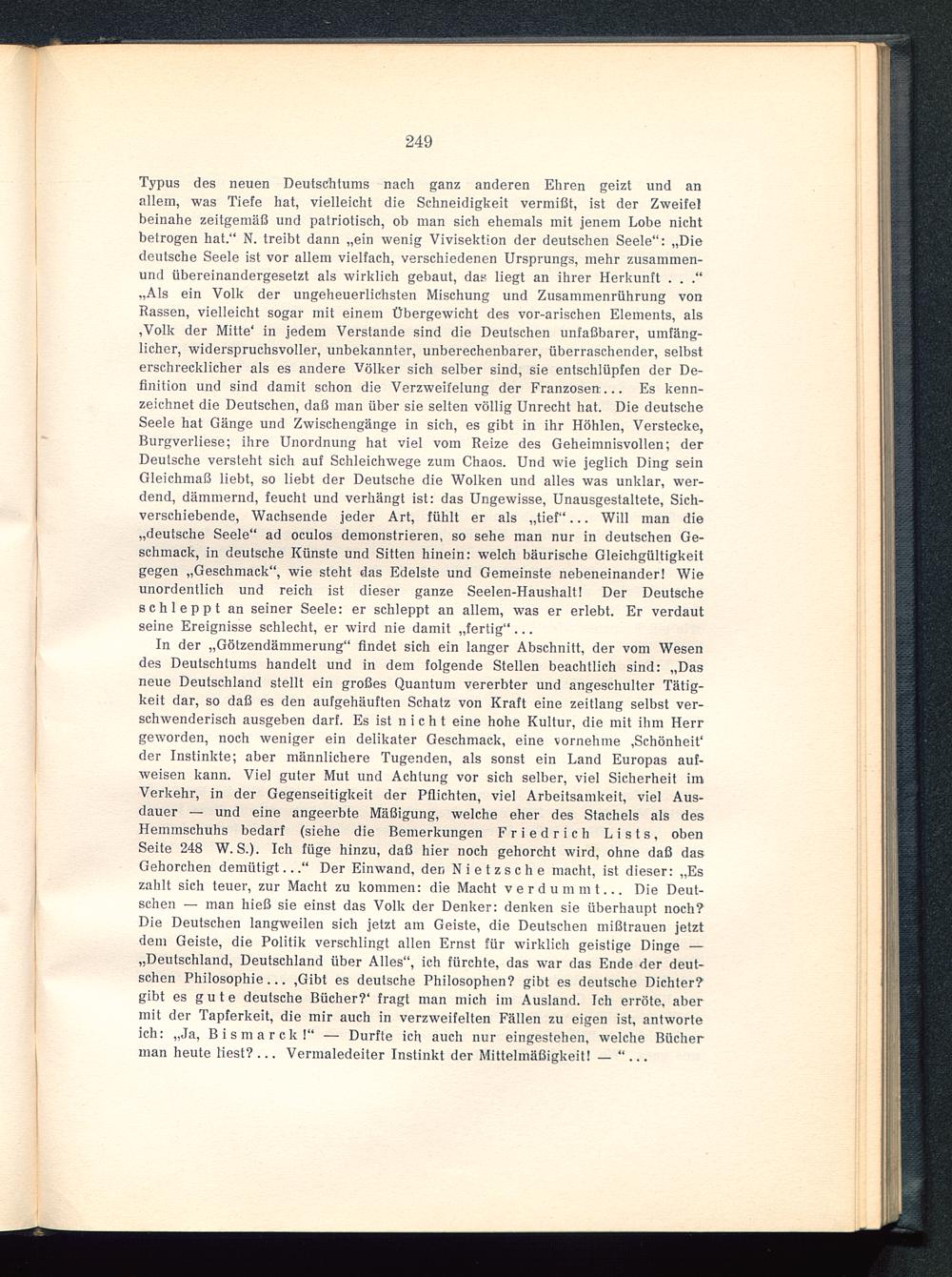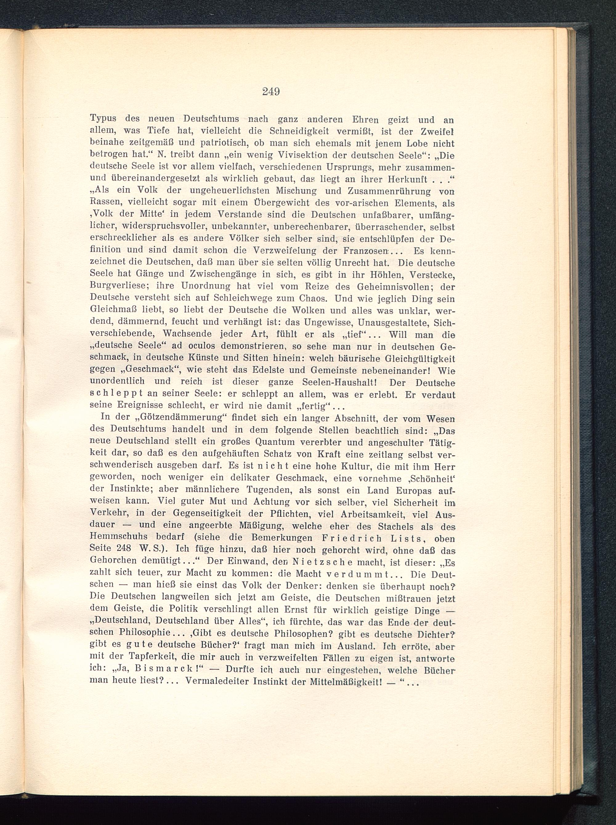 In der „Götzendämmerung“ findet sich ein langer Abschnitt, der vom Wesendes Deutschtums handelt und in dem folgende Stellen beachtlich sind: „Dasneue Deutschland stellt ein großes Quantum vererbter und angeschulter Tätig-keit dar, so daß es den aufgehäuften Schatz von Kraft eine zeitlang selbst ver-schwenderisch ausgeben darf. Es ist nicht eine hohe Kultur, die mit ihm Herrgeworden, noch weniger ein delikater Geschmack, eine vornehme ,Schönheit'der Instinkte; aber männlichere Tugenden, als sonst ein Land Europas auf-weisen kann. Viel guter Mut und Achtung vor sich selber, viel Sicherheit imVerkehr, in der Gegenseitigkeit der Pflichten, viel Arbeitsamkeit, viel Aus-dauer — und eine angeerbte Mäßigung, welche eher des Stachels als desHemmschuhs bedarf (siehe die Bemerkungen Friedrich Lists, obenSeite 248 W. S.). Ich füge hinzu, daß hier noch gehorcht wird, ohne daß dasGehorchen demütigt...“ Der Einwand, den Nietzsche macht, ist dieser: „Eszahlt sich teuer, zur Macht zu kommen: die Macht verdummt... Die Deut-schen — man hieß sie einst das Volk der Denker: denken sie überhaupt noch?Die Deutschen langweilen sich jetzt am Geiste, die Deutschen mißtrauen jetztdem Geiste, die Politik verschlingt allen Ernst für wirklich geistige Dinge —„Deutschland, Deutschland über Alles“, ich fürchte, das war das Ende der deut-schen Philosophie... ,Gibt es deutsche Philosophen? gibt es deutsche Dichter?gibt es gute deutsche Bücher?' fragt man mich im Ausland. Ich erröte, abermit der Tapferkeit, die mir auch in verzweifelten Fällen zu eigen ist, antworteich: „Ja, Bismarck I“ — Durfte ich auch nur eingestehen, welche Bücherman heute liest? ... Vermaledeiter Instinkt der Mittelmäßigkeit! — "...