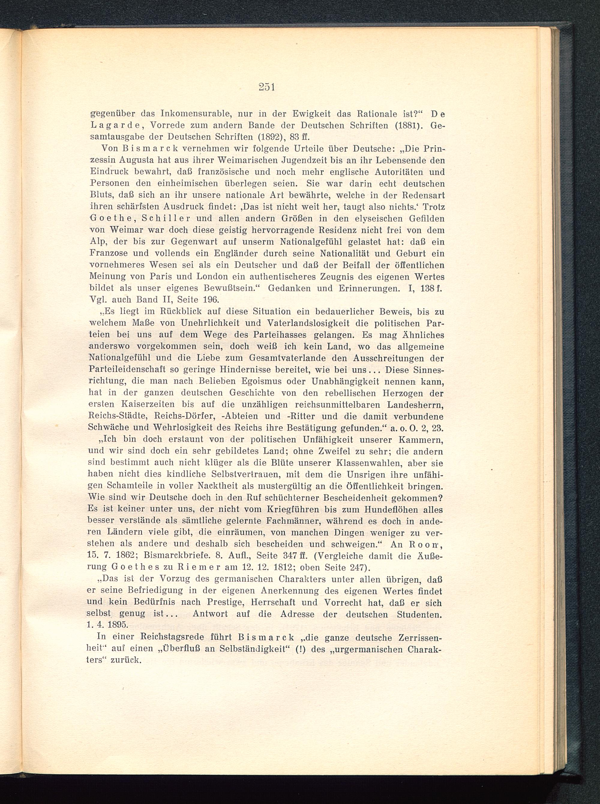Von Bismarck vernehmen wir folgende Urteile über Deutsche: „Die Prin-zessin Augusta hat aus ihrer Weimarischen Jugendzeit bis an ihr Lebensende denEindruck bewahrt, daß französische und noch mehr englische Autoritäten undPersonen den einheimischen überlegen seien. Sie war darin echt deutschenBluts, daß sich an ihr unsere nationale Art bewährte, welche in der Redensartihren schärfsten Ausdruck findet: ,Das ist nicht weit her, taugt also nichts.“ TrotzGoethe, Schiller und allen andern Größen in den elyseischen Gefildenvon Weimar war doch diese geistig hervorragende Residenz nicht frei von demAlp, der bis zur Gegenwart auf unserm Nationalgefühl gelastet hat: daß einFranzose und vollends ein Engländer durch seine Nationalität und Geburt einvornehmeres Wesen sei als ein Deutscher und daß der Beifall der öffentlichenMeinung von Paris und London ein authentischeres Zeugnis des eigenen Wertesbildet als unser eigenes Bewußtsein.“ Gedanken und Erinnerungen. I, 138 f.Vgl. auch Band II, Seite 196.