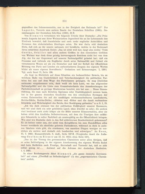 „Es liegt im Rückblick auf diese Situation ein bedauerlicher Beweis, bis zuwelchem Maße von Unehrlichkeit und Vaterlandslosigkeit die politischen Par-teien bei uns auf dem Wege des Parteihasses gelangen. Es mag Ähnlichesanderswo vorgekommen sein, doch weiß ich kein Land, wo das allgemeineNationalgefühl und die Liebe zum Gesamtvaterlande den Ausschreitungen derParteileidenschaft so geringe Hindernisse bereitet, wie bei uns... Diese Sinnes-richlung, die man nach Belieben Egoismus oder Unabhängigkeit nennen kann,hat in der ganzen deutschen Geschichte von den rebellischen Herzogen derersten Kaiserzeiten bis auf die unzähligen reichsunmittelbaren Landesherrn,Reichs-Städte, Reichs-Dörfer, -Abteien und -Ritter und die damit verbundeneSchwäche und Wehrlosigkeit des Reichs ihre Bestätigung gefunden.“ a. o. 0. 2, 23.