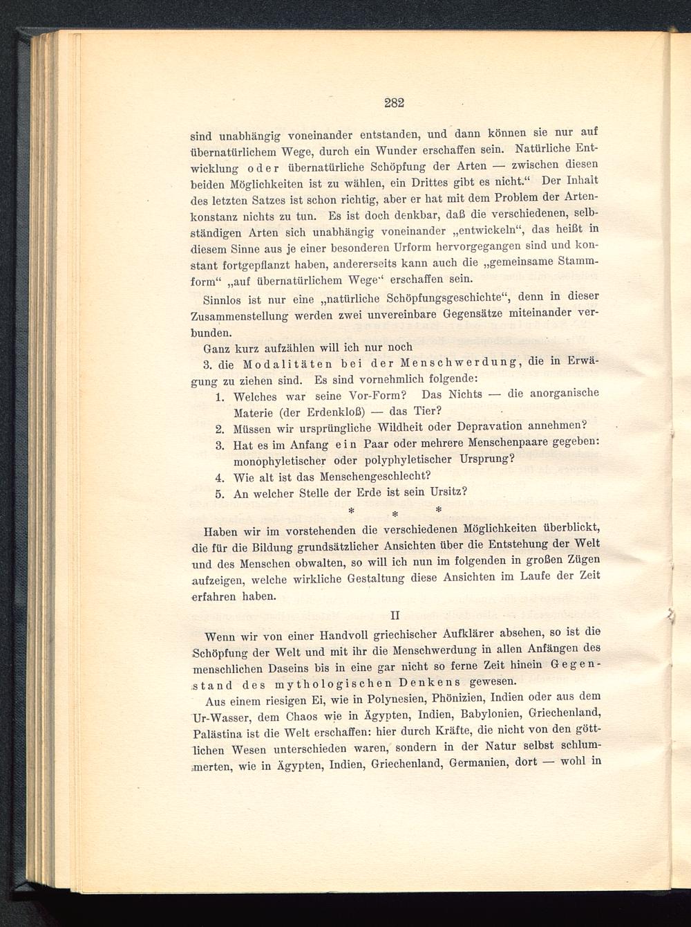 Haben wir im vorstehenden die verschiedenen Möglichkeiten überblickt,die für die Bildung grundsätzlicher Ansichten über die Entstehung der Weltund des Menschen obwalten, so will ich nun im folgenden in großen Zügenaufzeigen, welche wirkliche Gestaltung diese Ansichten im Laufe der Zeiterfahren haben.