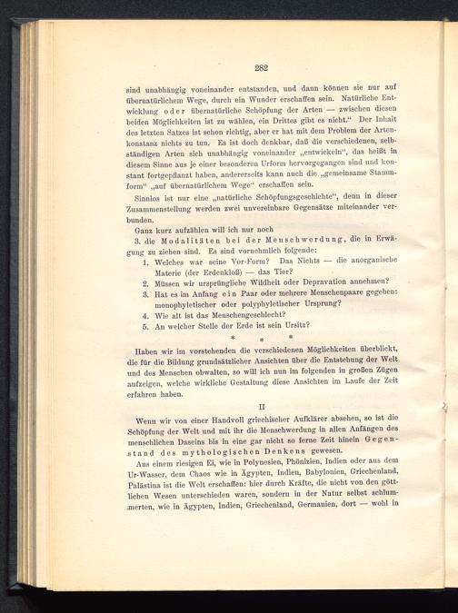 sind unabhängig voneinander entstanden, und dann können sie nur aufübernatürlichem Wege, durch ein Wunder erschaffen sein. Natürliche Ent-wicklung oder übernatürliche Schöpfung der Arten — zwischen diesenbeiden Möglichkeiten ist zu wählen, ein Drittes gibt es nicht.“ Der Inhaltdes letzten Satzes ist schon richtig, aber er hat mit dem Problem der Arten-konstanz nichts zu tun. Es ist doch denkbar, daß die verschiedenen, selb-ständigen Arten sich unabhängig voneinander „entwickeln“, das heißt indiesem Sinne aus je einer besonderen Urform hervorgegangen sind und kon-stant fortgepflanzt haben, andererseits kann auch die „gemeinsame Stamm-form“ „auf übernatürlichem Wege“ erschaffen sein.