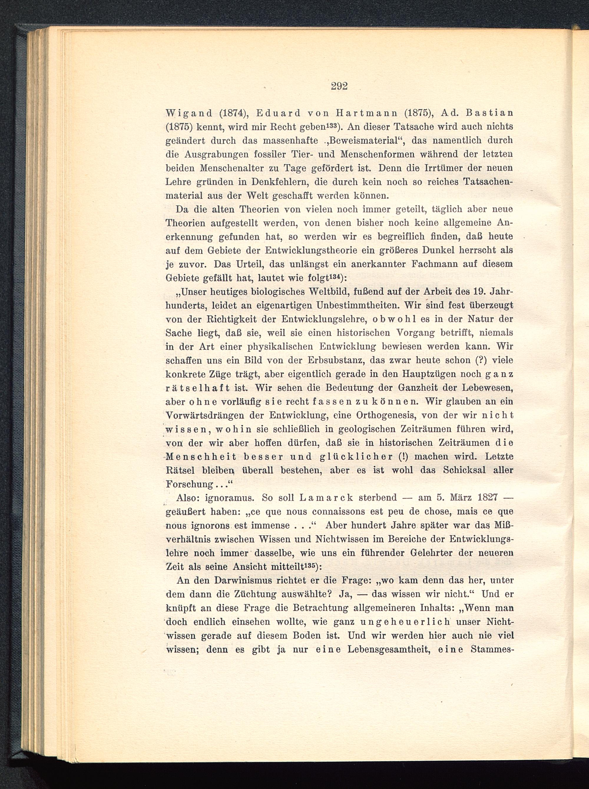 Also: ignoramus. So soll Lamarck sterbend — am 5. März 1827 —geäußert haben: „ce que nous connaissons est peu de chose, mais ce quenous ignorons est immense . . .“ Aber hundert Jahre später war das Miß-verhältnis zwischen Wissen und Nichtwissen im Bereiche der Entwicklungs-lehre noch immer dasselbe, wie uns ein führender Gelehrter der neuerenZeit als seine Ansicht mitteilt 135 ):