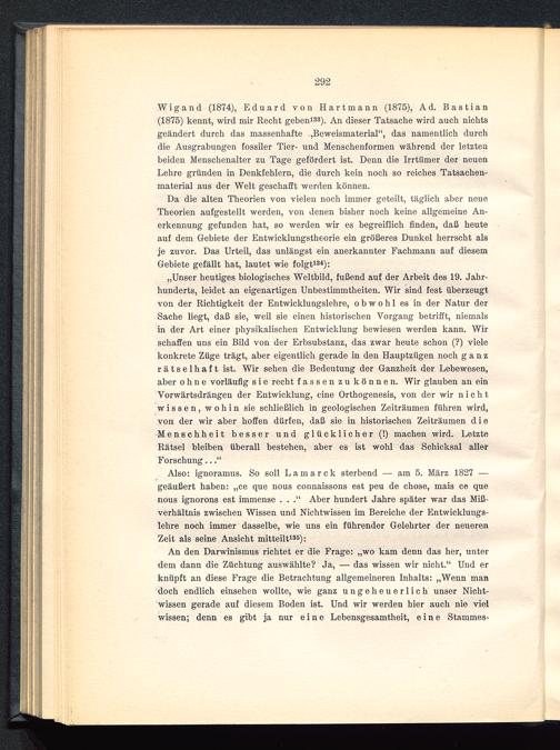 Wigand (1874), Eduard von Hartmann (1875), Ad. Bastian(1875) kennt, wird mir Recht geben 133 ). An dieser Tatsache wird auch nichtsgeändert durch das massenhafte „Beweismaterial“, das namentlich durchdie Ausgrabungen fossiler Tier- und Menschenformen während der letztenbeiden Menschenalter zu Tage gefördert ist. Denn die Irrtümer der neuenLehre gründen in Denkfehlern, die durch kein noch so reiches Tatsachen-material aus der Welt geschafft werden können.