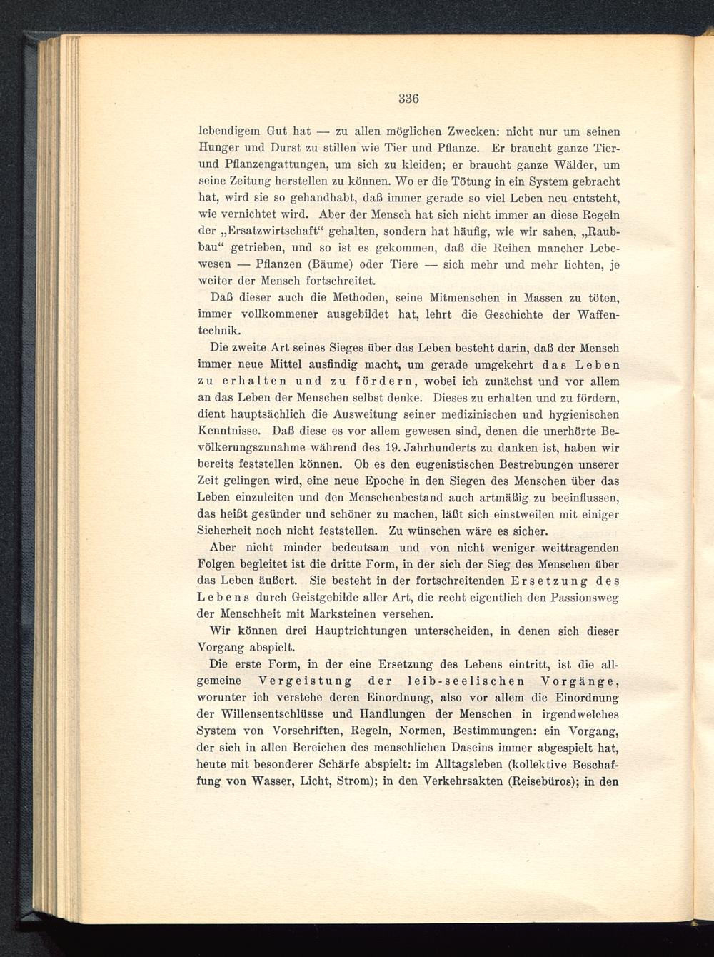 Aber nicht minder bedeutsam und von nicht weniger weittragendenFolgen begleitet ist die dritte Form, in der sich der Sieg des Menschen überdas Leben äußert. Sie besteht in der fortschreitenden Ersetzung desLebens durch Geistgebilde aller Art, die recht eigentlich den Passionswegder Menschheit mit Marksteinen versehen.