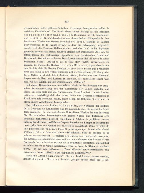 Mit dieser Diskussion war man mitten hinein in das Problem der ethni-schen Zusammensetzung und der Entstehung der Völker gestoßen unddieses Problem hielt nun die französischen Historiker fest. In der Restau-rationszeit beschäftigt sich eine ganze Reihe von Geschichtsschreibern inFrankreich mit derselben Frage, unter denen die Gebrüder T h i e r r y vorallem unsere Anteilnahme beanspruchen.