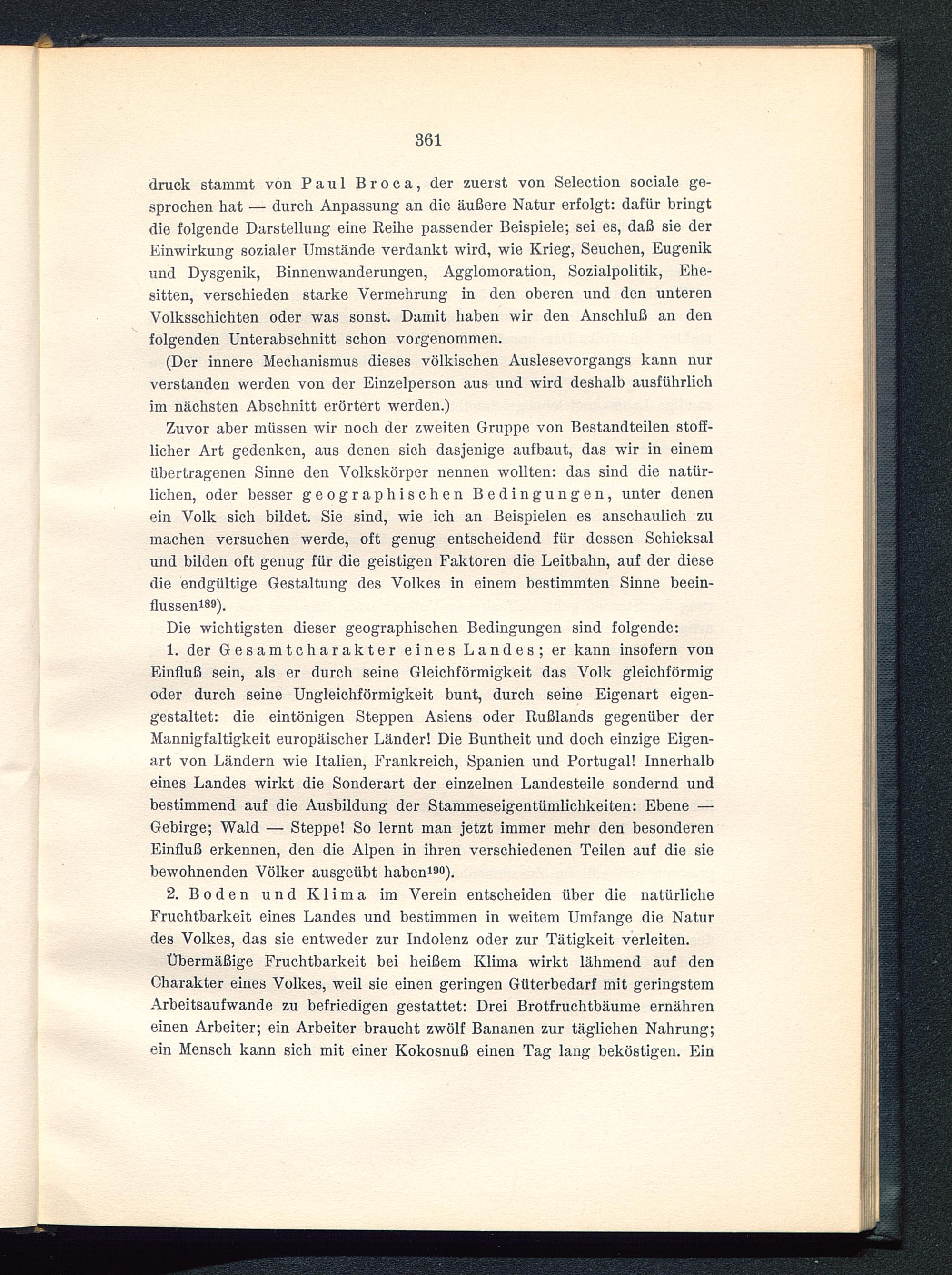 druck stammt von Paul Broca , der zuerst von Selection sociale ge-sprochen hat — durch Anpassung an die äußere Natur erfolgt: dafür bringtdie folgende Darstellung eine Reihe passender Beispiele; sei es, daß sie derEinwirkung sozialer Umstände verdankt wird, wie Krieg, Seuchen, Eugenikund Dysgenik, Binnenwanderungen, Agglomoration, Sozialpolitik, Ehe-sitten, verschieden starke Vermehrung in den oberen und den unterenVolksschichten oder was sonst. Damit haben wir den Anschluß an denfolgenden Unterabschnitt schon vorgenommen.