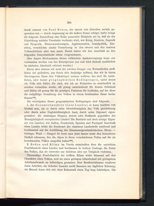 Zuvor aber müssen wir noch der zweiten Gruppe von Bestandteilen stoff-licher Art gedenken, aus denen sich dasjenige aufbaut, das wir in einemübertragenen Sinne den Volkskörper nennen wollten: das sind die natür-lichen, oder besser geographischen Bedingungen, unter denenein Volk sich bildet. Sie sind, wie ich an Beispielen es anschaulich zumachen versuchen werde, oft genug entscheidend für dessen Schicksalund bilden oft genug für die geistigen Faktoren die Leitbahn, auf der diesedie endgültige Gestaltung des Volkes in einem bestimmten Sinne beein-flussen 189 ).