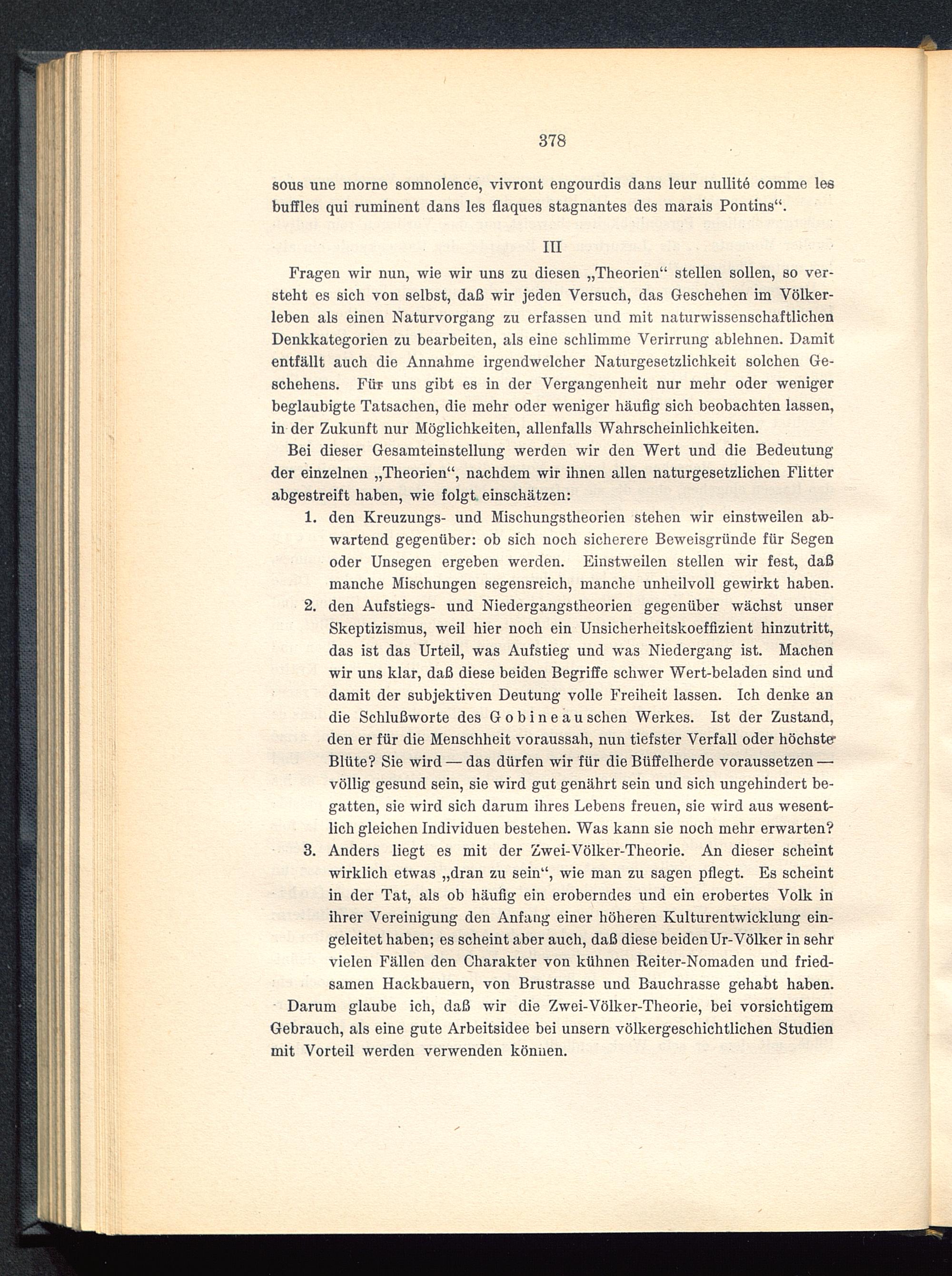 Darum glaube ich, daß wir die Zwei-Völker-Theorie, bei vorsichtigemGebrauch, als eine gute Arbeitsidee bei unsern völkergeschichtlichen Studienmit Vorteil werden verwenden können.