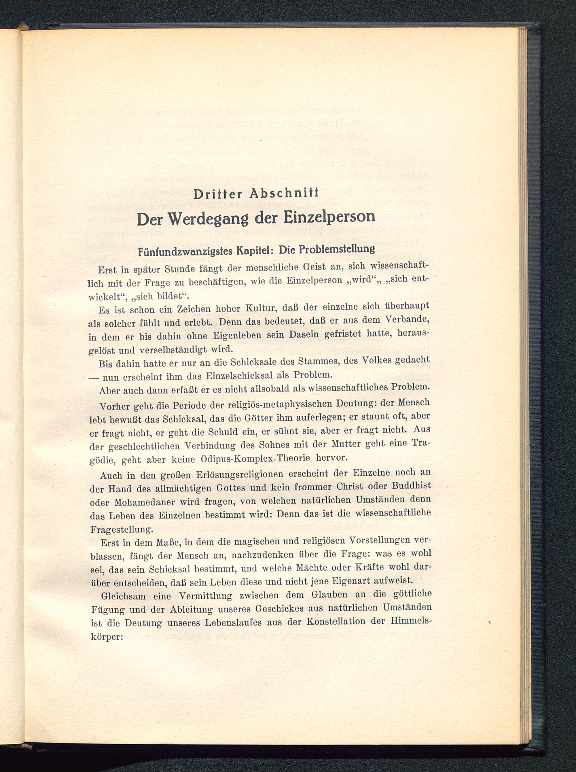 Erst in dem Maße, in dem die magischen und religiösen Vorstellungen ver-blassen, fängt der Mensch an, nachzudenken über die Frage: was es wohlsei, das sein Schicksal bestimmt, und welche Mächte oder Kräfte wohl dar-über entscheiden, daß sein Leben diese und nicht jene Eigenart aufweist.