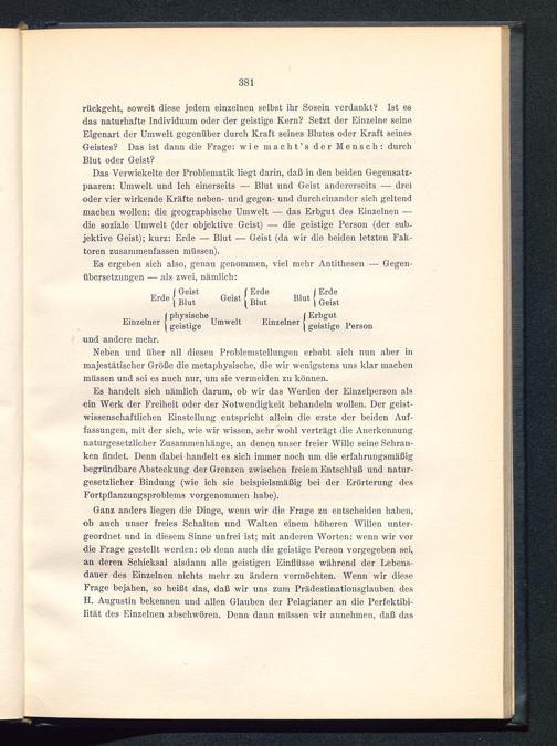 Das Verwickelte der Problematik liegt darin, daß in den beiden Gegensatz-paaren: Umwelt und Ich einerseits — Blut und Geist andererseits — dreioder vier wirkende Kräfte neben- und gegen- und durcheinander sich geltendmachen wollen: die geographische Umwelt — das Erbgut des Einzelnen —die soziale Umwelt (der objektive Geist) — die geistige Person (der sub-jektive Geist); kurz: Erde — Blut — Geist (da wir die beiden letzten Fak-toren zusammenfassen müssen).