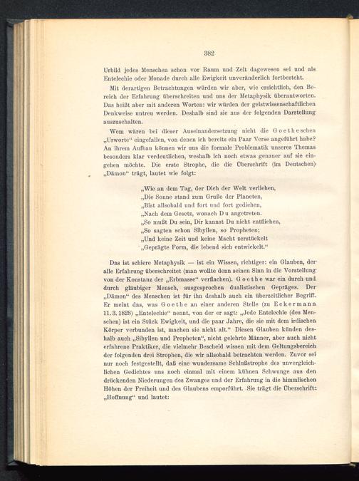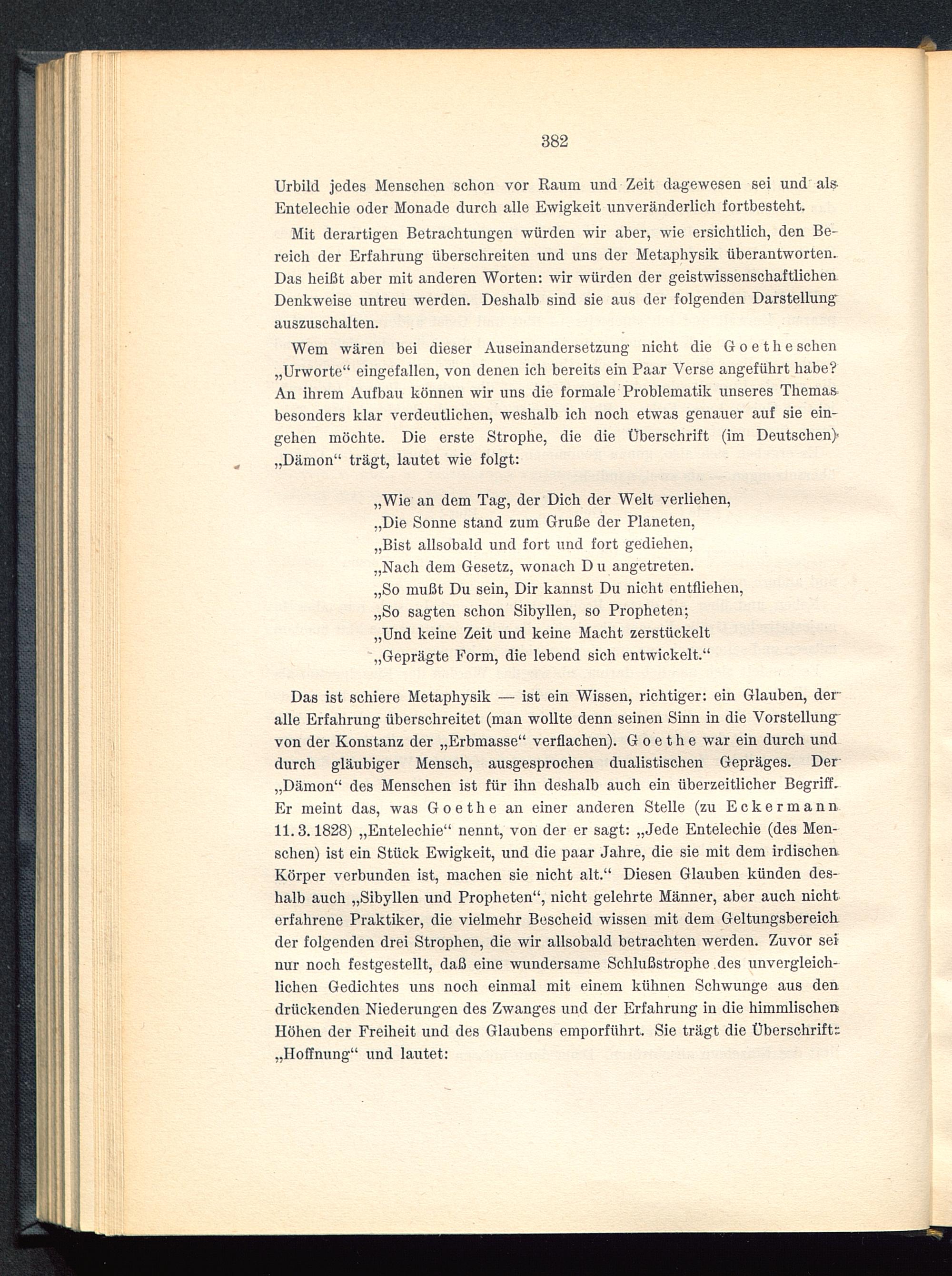 Das ist schiere Metaphysik — ist ein Wissen, richtiger: ein Glauben, deralle Erfahrung überschreitet (man wollte denn seinen Sinn in die Vorstellungvon der Konstanz der „Erbmasse“ verflachen). Goethe war ein durch unddurch gläubiger Mensch, ausgesprochen dualistischen Gepräges. Der„Dämon“ des Menschen ist für ihn deshalb auch ein überzeitlicher Begriff.Er meint das, was Goethe an einer anderen Stelle (zu Eckermann11.3.1828) „Entelechie “ nennt, von der er sagt: „Jede Entelechie (des Men-schen) ist ein Stück Ewdgkeit, und die paar Jahre, die sie mit dem irdischemKörper verbunden ist, machen sie nicht alt.“ Diesen Glauben künden des-halb auch „Sibyllen und Propheten“, nicht gelehrte Männer, aber auch nichterfahrene Praktiker, die vielmehr Bescheid wissen mit dem Geltungsbereichder folgenden drei Strophen, die wir allsobald betrachten werden. Zuvor seinur noch festgestellt, daß eine wundersame Schlußstrophe des unvergleich-lichen Gedichtes uns noch einmal mit einem kühnen Schwünge aus dendrückenden Niederungen des Zwanges und der Erfahrung in die himmlischenHöhen der Freiheit und des Glaubens emporführt. Sie trägt die Überschrift:„Hoffnung“ und lautet: