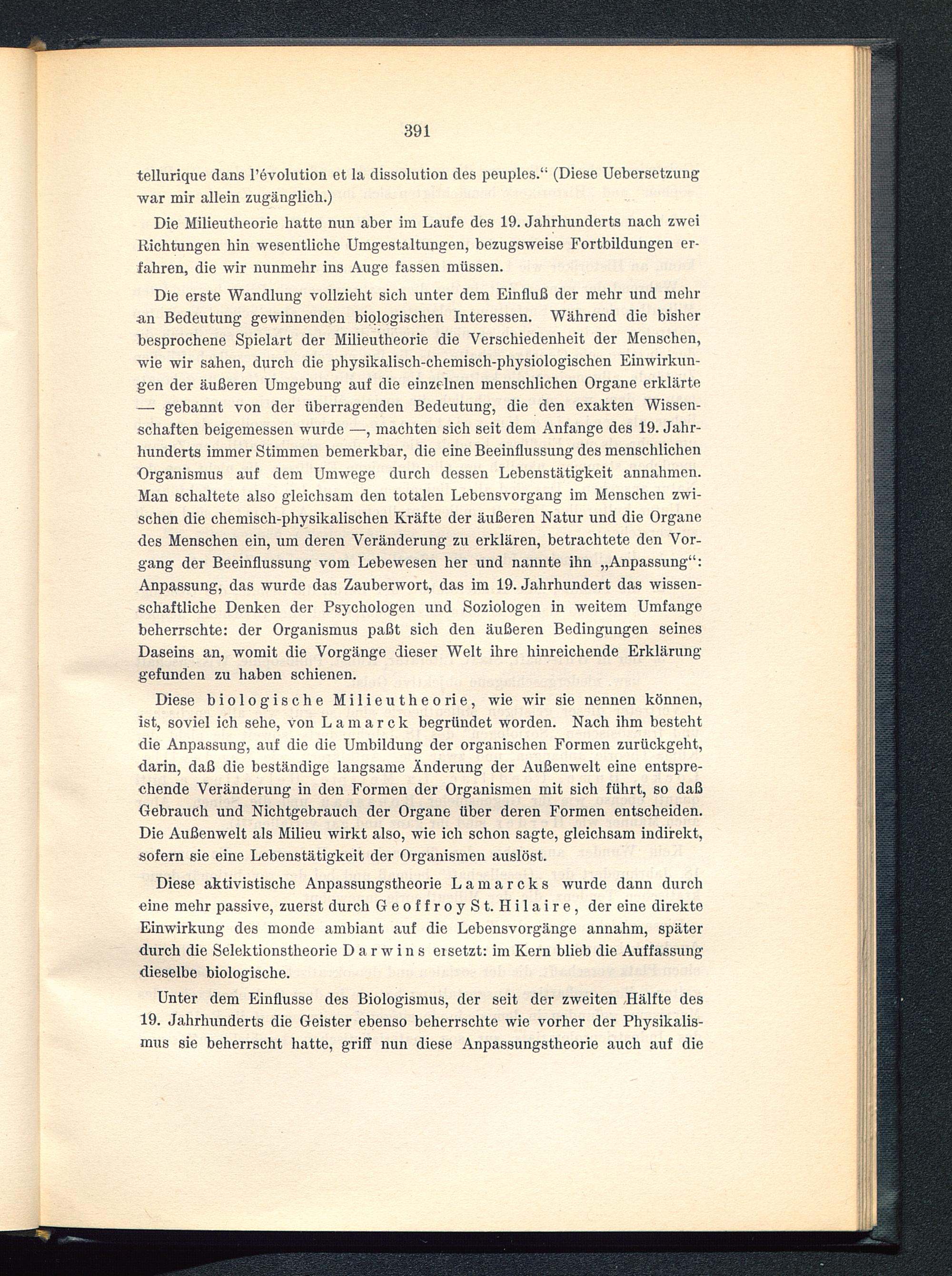 Diese aktivistische Anpassungstheorie Lamarcks wurde dann durcheine mehr passive, zuerst durch GeoffroySt. Hilaire, der eine direkteEinwirkung des monde ambiant auf die Lebensvorgänge annahm, späterdurch die Selektionstheorie Darwins ersetzt: im Kern blieb die Auffassungdieselbe biologische.