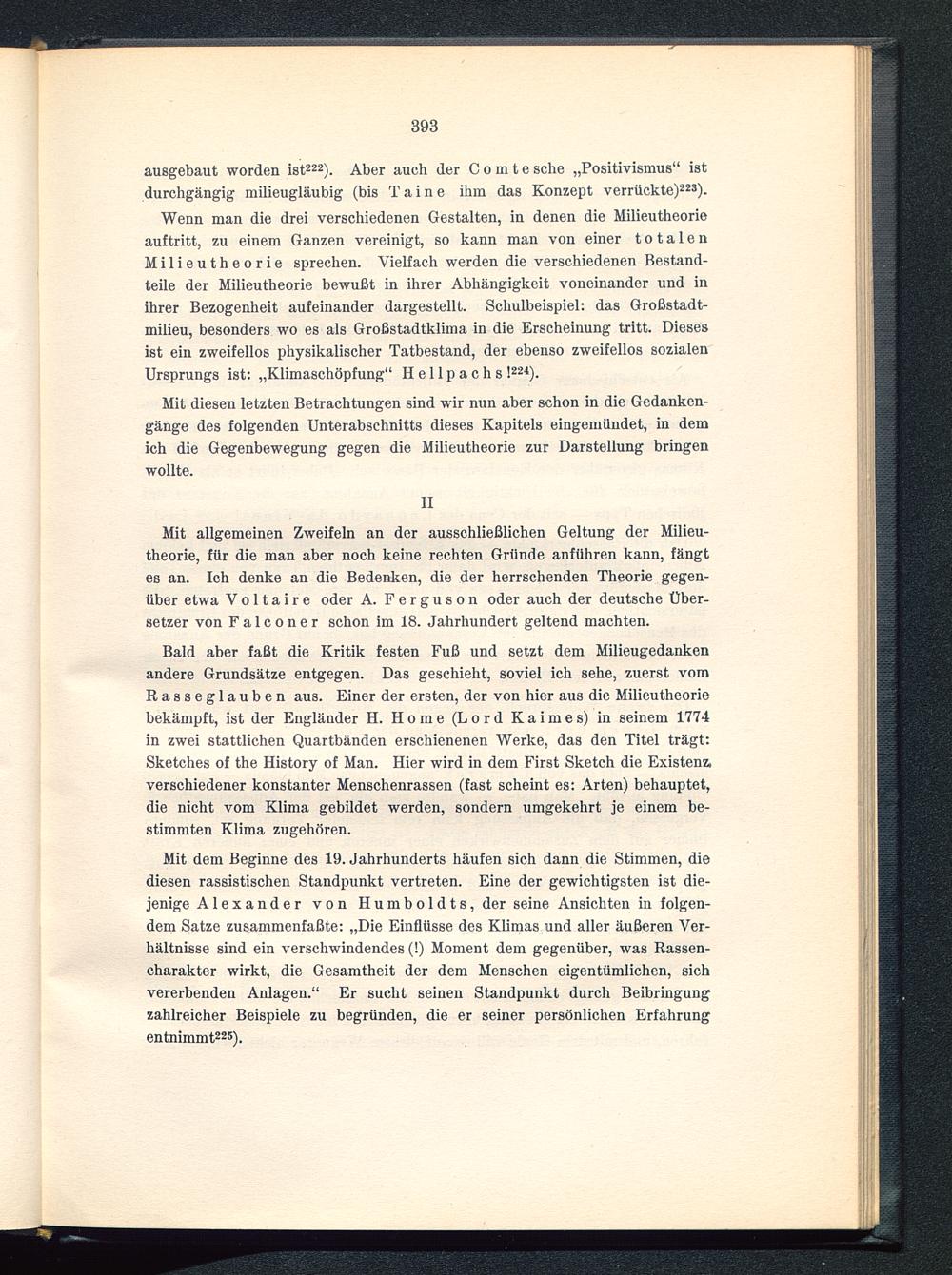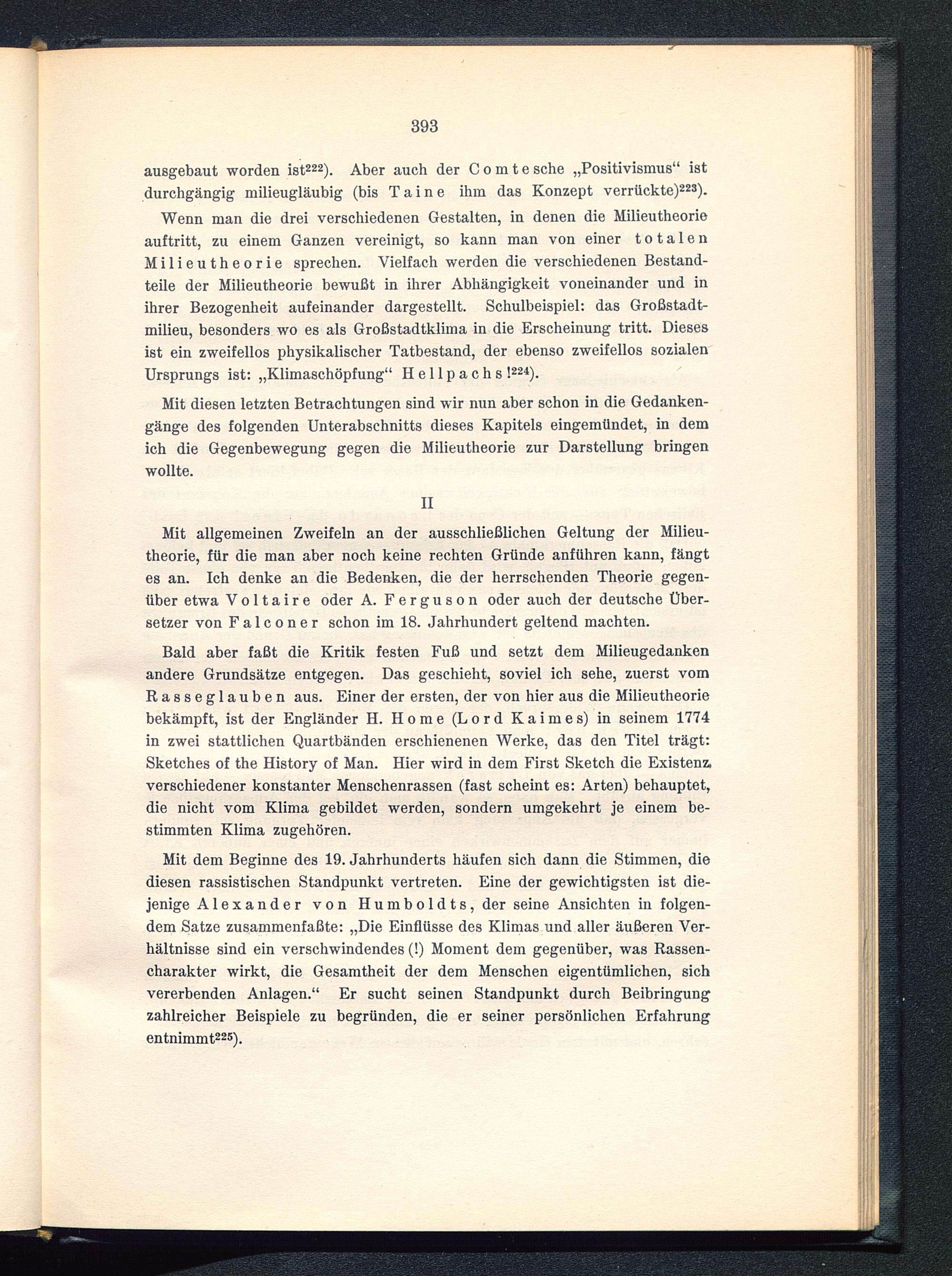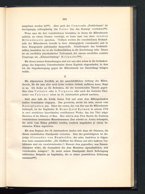 Mit allgemeinen Zweifeln an der ausschließlichen Geltung der Milieu-theorie, für die man aber noch keine rechten Gründe anführen kann, fängtes an. Ich denke an die Bedenken, die der herrschenden Theorie gegen-über etwa Voltaire oder A. Ferguson oder auch der deutsche Über-setzer von F a 1 c o n e r schon im 18. Jahrhundert geltend machten.