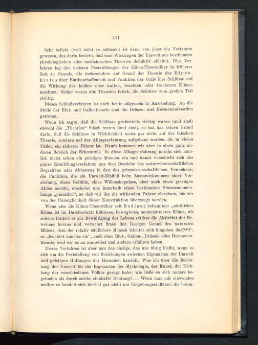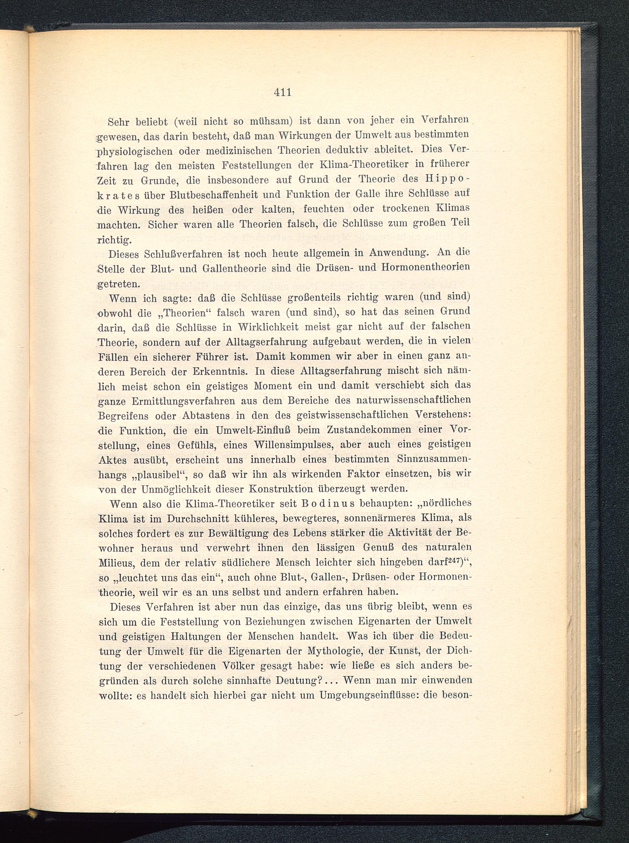 Wenn also die Klima-Theoretiker seit Bodinus behaupten: „nördlichesKlima ist im Durchschnitt kühleres, bewegteres, sonnenärmeres Klima, alssolches fordert es zur Bewältigung des Lebens stärker die Aktivität der Be-wohner heraus und verwehrt ihnen den lässigen Genuß des naturalenMilieus, dem der relativ südlichere Mensch leichter sich hingeben darf 247 )“,so „leuchtet uns das ein“, auch ohne Blut-, Gallen-, Drüsen- oder Hormonen-theorie, weil wir es an uns selbst und andern erfahren haben.
