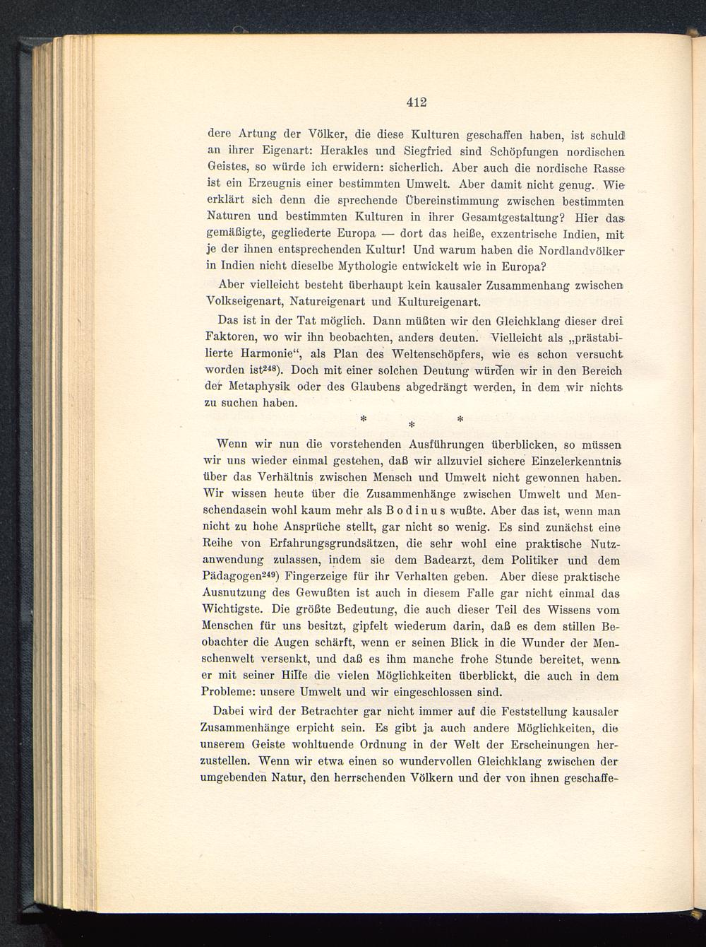 Wenn wir nun die vorstehenden Ausführungen überblicken, so müssenwir uns wieder einmal gestehen, daß wir allzuviel sichere Einzelerkenntnisüber das Verhältnis zwischen Mensch und Umwelt nicht gewonnen haben.Wir wissen heute über die Zusammenhänge zwischen Umwelt und Men-schendasein wohl kaum mehr als B o d i n u s wußte. Aber das ist, wenn mannicht zu hohe Ansprüche stellt, gar nicht so wenig. Es sind zunächst eineReihe von Erfahrungsgrundsätzen, die sehr wohl eine praktische Nutz-anwendung zulassen, indem sie dem Badearzt, dem Politiker und demPädagogen 248 ) Fingerzeige für ihr Verhalten geben. Aber diese praktischeAusnutzung des Gewußten ist auch in diesem Falle gar nicht einmal dasWichtigste. Die größte Bedeutung, die auch dieser Teil des Wissens vomMenschen für uns besitzt, gipfelt wiederum darin, daß es dem stillen Be-obachter die Augen schärft, wenn er seinen Blick in die Wunder der Men-schenwelt versenkt, und daß es ihm manche frohe Stunde bereitet, wenn,er mit seiner Hilfe die vielen Möglichkeiten überblickt, die auch in demProbleme: unsere Umwelt und wir eingeschlossen sind.