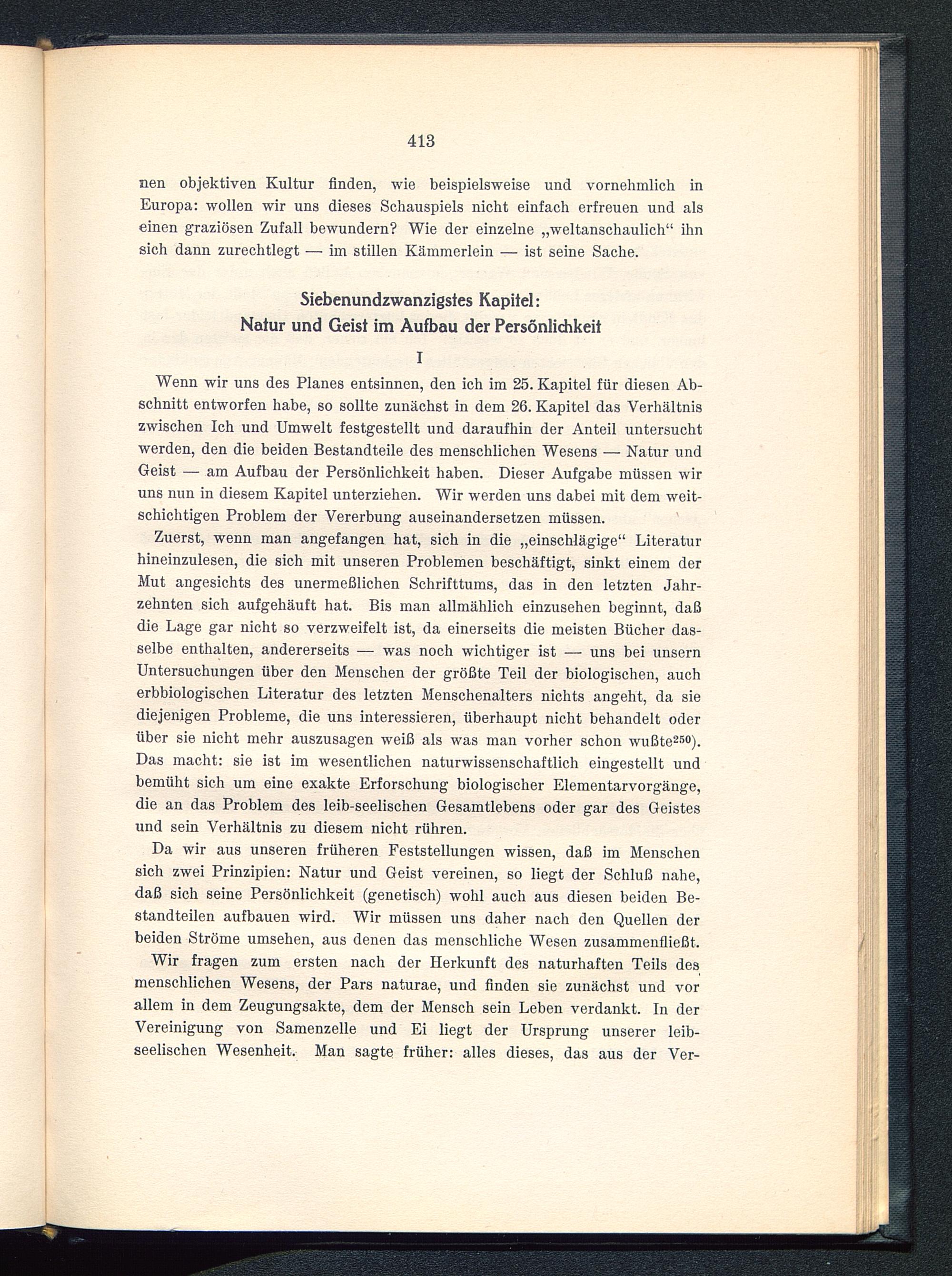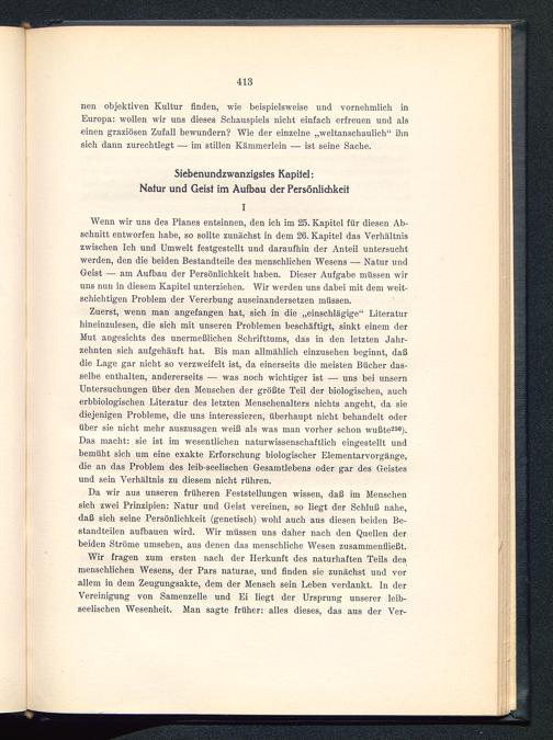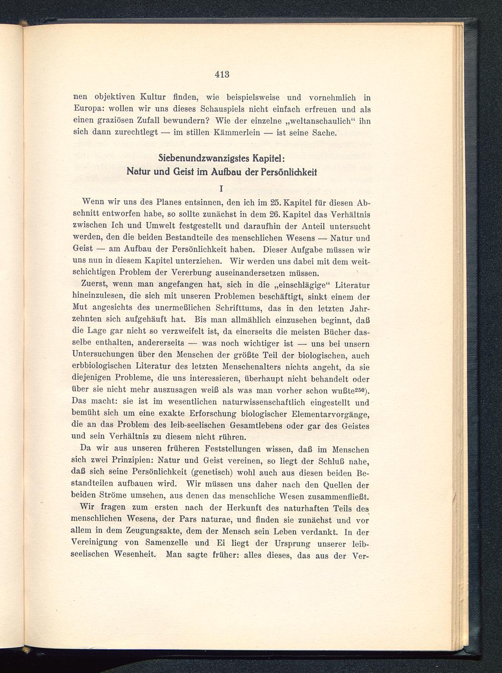 Wenn wir uns des Planes entsinnen, den ich im 25. Kapitel für diesen Ab-schnitt entworfen habe, so sollte zunächst in dem 26. Kapitel das Verhältniszwischen Ich und Umwelt festgestellt und daraufhin der Anteil untersuchtwerden, den die beiden Bestandteile des menschlichen Wesens — Natur undGeist — am Aufbau der Persönlichkeit haben. Dieser Aufgabe müssen wiruns nun in diesem Kapitel unterziehen. Wir werden uns dabei mit dem weit-schichtigen Problem der Vererbung auseinandersetzen müssen.