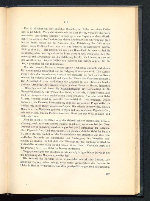 Das ist offenbar ein sehr hübscher Gedanke, der leider nur einen Fehlerhat: er ist falsch. Vielleicht können wir ihn aber retten, wenn wir die Sacheumdrehen. Auf Grund folgender Erwägungen: die Hypothese einer allmäh-lichen Entstehung der Denkformen durch kontinuierliche Übertragung läuftletzten Endes hinaus auf die Annahme einer Entstehung des Geistes ausSeele: eines Un-Gedankens, wie wir aus früheren Betrachtungen wissen.Richtig aber ist — das müssen wir uns zum Bewußtsein bringen — daß dieDenkkategorien doch irgendwie im Blute stecken und wenigstens ihre Be-nutzung und Anwendung auf der Erfahrung beruht: wir können es also beider Antithese von Art und Individuum belassen und sagen: A priori für dieArt, a posteriori für das Individuum.