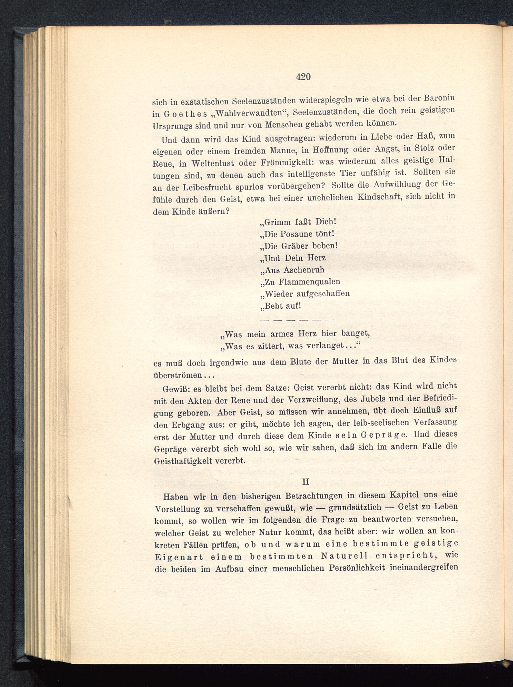 sich in exstatischen Seelenzuständen widerspiegeln wie etwa bei der Baroninin Goethes „Wahlverwandten“, Seelenzuständen, die doch rein geistigenUrsprungs sind und nur von Menschen gehabt werden können.