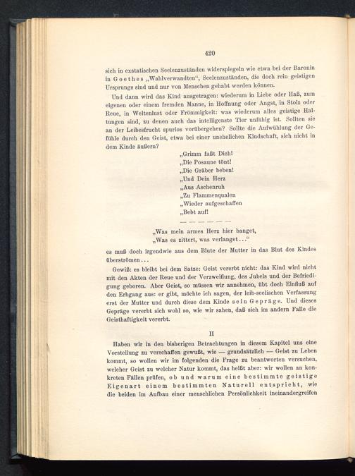 Und dann wird das Kind ausgetragen: wiederum in Liebe oder Haß, zumeigenen oder einem fremden Manne, in Hoffnung oder Angst, in Stolz oderReue, in Weltenlust oder Frömmigkeit: was wiederum alles geistige Hal-tungen sind, zu denen auch das intelligenste Tier unfähig ist. Sollten siean der Leibesfrucht spurlos vorübergehen? Sollte die Aufwühlung der Ge-fühle durch den Geist, etwa bei einer unehelichen Kindschaft, sich nicht indem Kinde äußern?