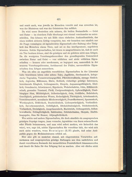 Wer solche und andere Eigenschaften, die doch sämtlich ein ausgesprochengeistiges Gepräge tragen, (man versuche, irgendeine von ihnen seinem Hundeoder Pferde beizumessen, und man wird sofort merken, wie lächerlich daswäre), wer, sage ich, solche Eigenschaften für vererbbar hält, der wird sichauch nicht wundern, wenn Montaigne (II. 37) glaubt, daß seine Anti-pathie gegen die Medizindoktoren erblich sei.