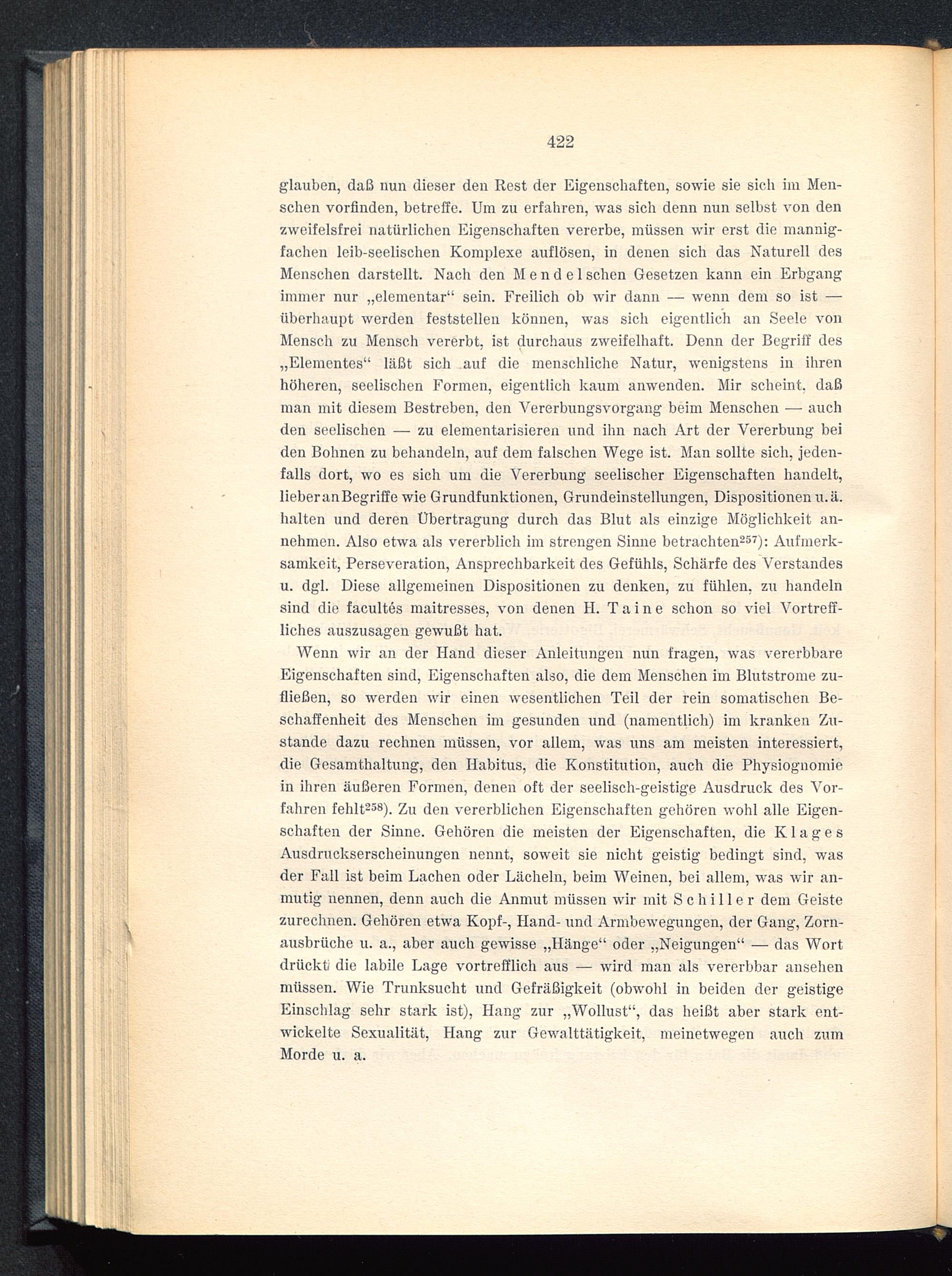 glauben, daß nun dieser den Rest der Eigenschaften, sowie sie sich im Men-schen vorfinden, betreffe. Um zu erfahren, was sich denn nun selbst von denzweifelsfrei natürlichen Eigenschaften vererbe, müssen wir erst die mannig-fachen leib-seelischen Komplexe auflösen, in denen sich das Naturell desMenschen darstellt. Nach den Mendelschen Gesetzen kann ein Erbgangimmer nur „elementar“ sein. Freilich ob wir dann — wenn dem so ist —•überhaupt werden feststellen können, was sich eigentlich an Seele vonMensch zu Mensch vererbt, ist durchaus zweifelhaft. Denn der Begriff des„Elementes“ läßt sich auf die menschliche Natur, wenigstens in ihrenhöheren, seelischen Formen, eigentlich kaum anwenden. Mir scheint, daßman mit diesem Bestreben, den Vererbungsvorgang beim Menschen — auchden seelischen — zu elementarisieren und ihn nach Art der Vererbung beiden Bohnen zu behandeln, auf dem falschen Wege ist. Man sollte sich, jeden-falls dort, wo es sich um die Vererbung seelischer Eigenschaften handelt,lieberanBegriffe wie Grundfunktionen, Grundeinstellungen, Dispositionen u.ä.halten und deren Übertragung durch das Blut als einzige Möglichkeit an-nehmen. Also etwa als vererblich im strengen Sinne betrachten 257 ): Aufmerk-samkeit, Perseveration, Ansprechbarkeit des Gefühls, Schärfe des Verstandesu. dgl. Diese allgemeinen Dispositionen zu denken, zu fühlen, zu handelnsind die facultes maitresses, von denen H. T a i n e schon so viel Vortreff-liches auszusagen gewußt hat.