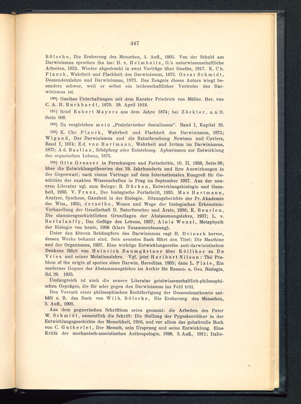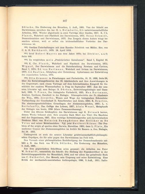 134 ) Otto Grosser in Forschungen und Fortschritte, 10. II. 1938, Seite 58;über die Entwicklungstheorien des 19. Jahrhunderts und ihre Auswirkungen inder Gegenwart; nach einem Vortrage auf dem Internationalen Kongreß für Ge-schichte der exakten Wissenschaften in Prag im September 1937. Aus der neu-eren Literatur vgl. zum Belege: B. Dürken, Entwicklungsbiologie und Ganz-heit, 1936. V. Franz, Der biologische Fortschritt, 1935. Max Hart mann,Analyse, Synthese, Ganzheit in der Biologie. Sitzungsberichte der Pr. Akademieder Wiss., 1935; derselbe, Wesen und Wege der biologischen Erkenntnis:Verhandlung der Gesellschaft D. Naturforscher und Ärzte, 1936; K. Beurlen,Die stammesgeschichtlichen Grundlagen der Abstammungslehre, 1937; L. v.Bertalanffy , Das Gefüge des Lebens, 1937; Alois W e n z 1, Metaphysikder Biologie von heute, 1938 (klare Zusammenfassung).