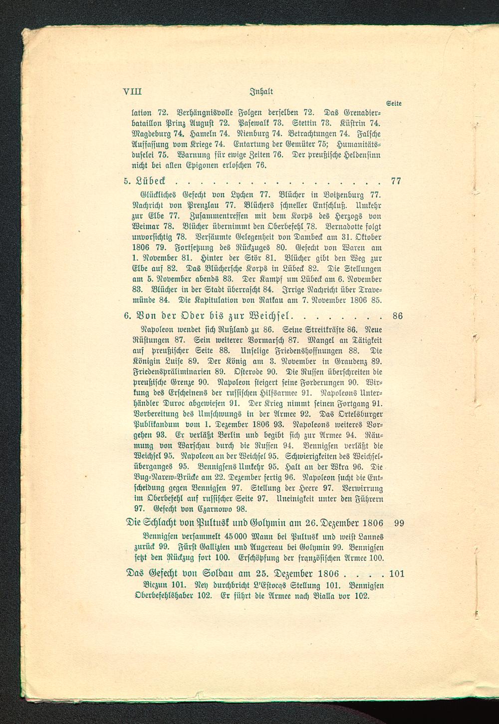 Napoleou wendet sich Rußland zu 86. Seine Streitkräfte 86. NeueRüstungen 87. Sein weiterer Vormarsch 87. Mangel au Tätigkeitauf preußischer Seite 88. Unselige Friedenshoffnungen 88. DieKönigin Luise 89. Der König am 3. November in Graudenz 89.Friedenspräliminarien 89. Osterode 90. Die Russen überschreiten diepreußische Grenze 90. Napoleon steigert seine Forderungen 90. Wir-kung des Erscheinens der russischen Hilfsarmee 91. Napoleons Unter-händler Duroc abgewiesen 91. Der Krieg nimmt seinen Fortgang 91.Vorbereitung des Umschwungs in der Armee 92. Das OrtelsburgerPublikandum vom 1. Dezember 1806 93. Napoleons weiteres Vor-gehen 93. Er verläßt Berlin und begibt sich zur Armee 94. Räu-mung von Warschau durch die Russen 94. Vennigsen verläßt dieWeichsel 95. Napoleon an der Weichsel 95. Schwierigkeiten des Weichsel-überganges 95. Bennigsens Umkehr 95. Halt an der Wkra 96. DieBug-Narew-Brücke am 22. Dezember fertig 96. Napoleon sucht die Ent-scheidung gegen Vennigsen 97. Stellung der Heere 97. Verwirrungim Oberbefehl ans russischer Seite 97. Uneinigkeit unter den Führern97. Gefecht von Czarnowo 93.