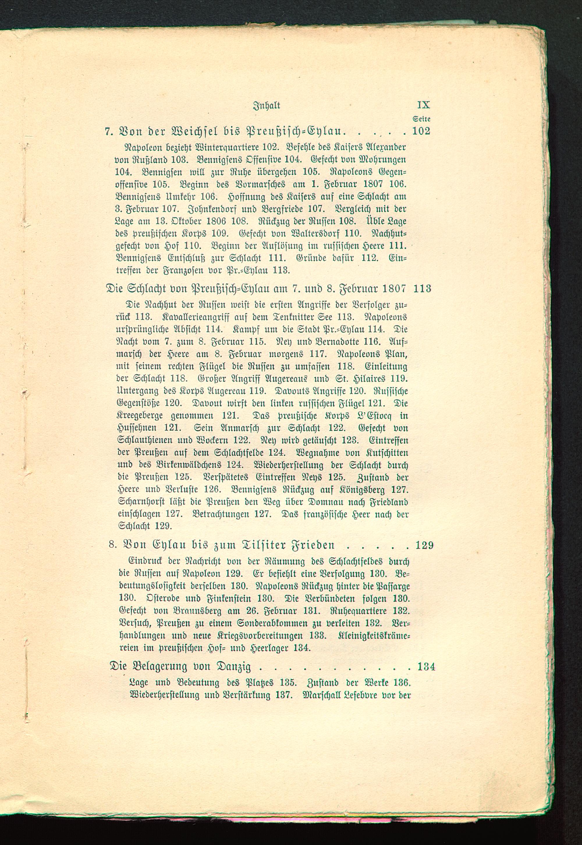 Eindruck der Nachricht von der Räumung des Schlachtfeldes durchdie Russen auf Napoleon 129. Er befiehlt eine Verfolgung 130. Be-deutungslosigkeit derselben 130. Napoleons Rückzug hinter die Passarge130. Osterode und Finkenstein 130. Die Verbündeten folgen 130.Gefecht von Brannsberg am 26. Februar 131. Ruheauartiere 132.Versuch, Preußen zu einem Sonderabkommen zu verleiten 132. Ver-handlungen und neue Kriegsvorbereitungen 133. Kleinigkeitskräme-reien im preußischen Hof- und Heerlager 134.