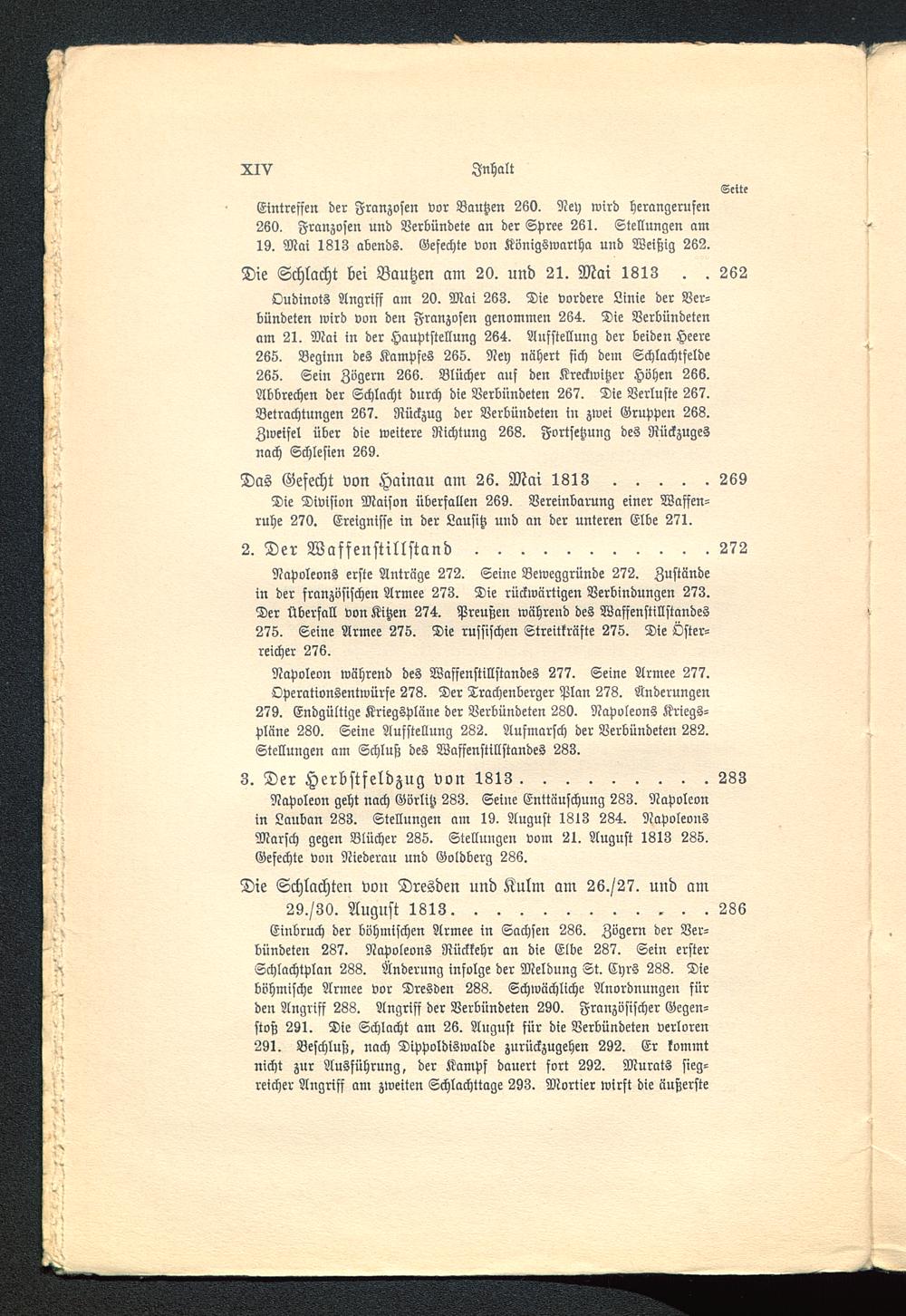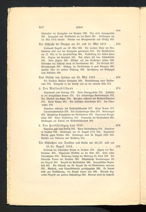 Einbruch der böhmischen Armee in Sachsen 286. Zögern der Ver-bündeten 287. Napoleons Rückkehr an die Elbe 287. Sein ersterSchlachtplan 288. Änderung infolge der Meldung St. Cyrs 283. Dieböhmische Armee vor Dresden 283. Schwächliche Anordnungen fürden Angriff 288. Angriff der Verbündeten 290. Französischer Gegen-stoß 291. Die Schlacht am 26. August für die Verbündeten verloren291. Beschluß, nach Dippoldiswalde zurückzugehen 292. Er kommtnicht zur Ausführung, der Kampf dauert fort 292. Murats sieg-reicher Angriff am zweiten Schlachttage 293. Mortier wirft die äußerste